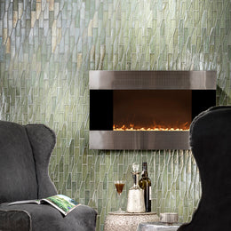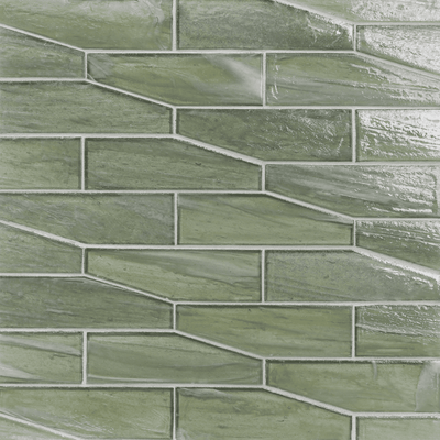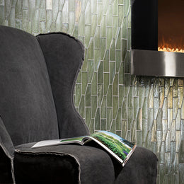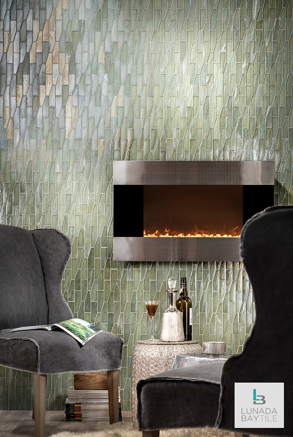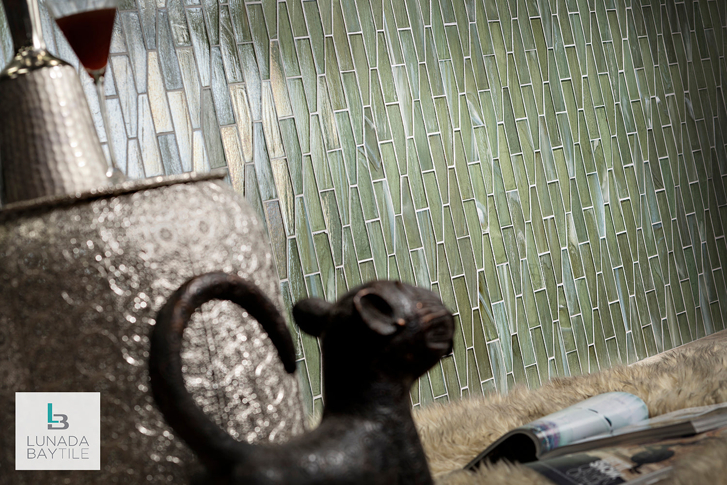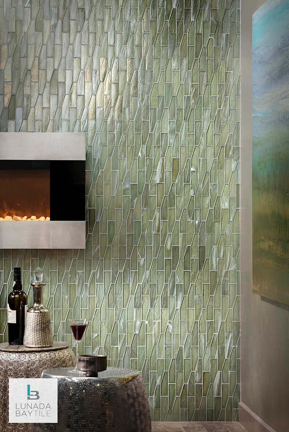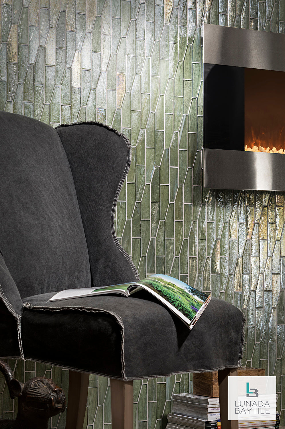 The clipped rectangular shape of these hand-crafted glass mosaics bring a unique texture and feeling to this space that is soothing and luxurious. Seen here in the Clipper pattern from our Luce series, in the color Bamboo Garden.