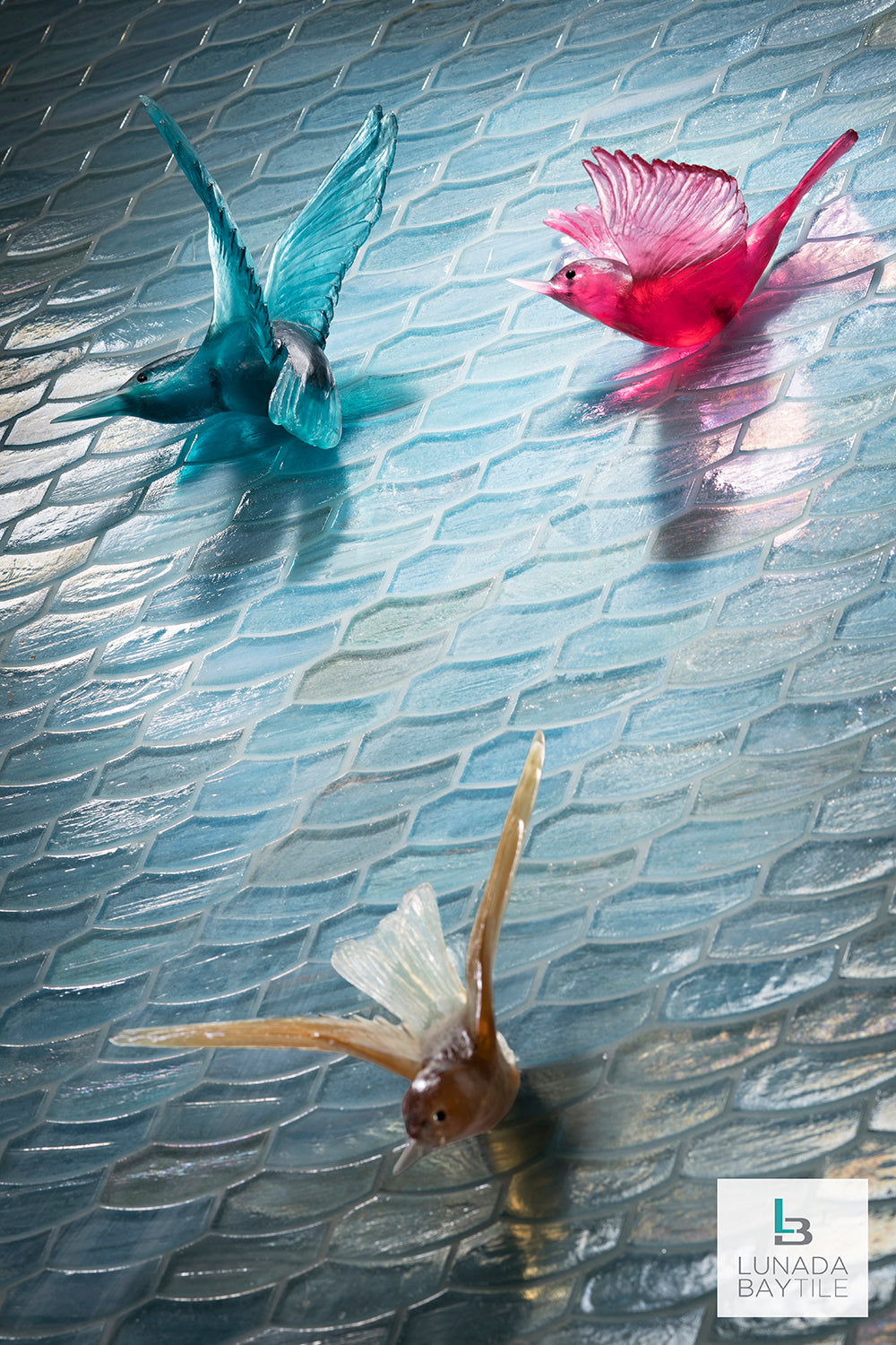 Our patented Luce Feather shape brings a unique and sophisticated yet playful surface that transforms the light within the room, and the nature-inspired color palette brings in a feeling of the outdoors that easily brings connection within the space. Seen here in Mineral Springs in an iridescent Pearl finish.