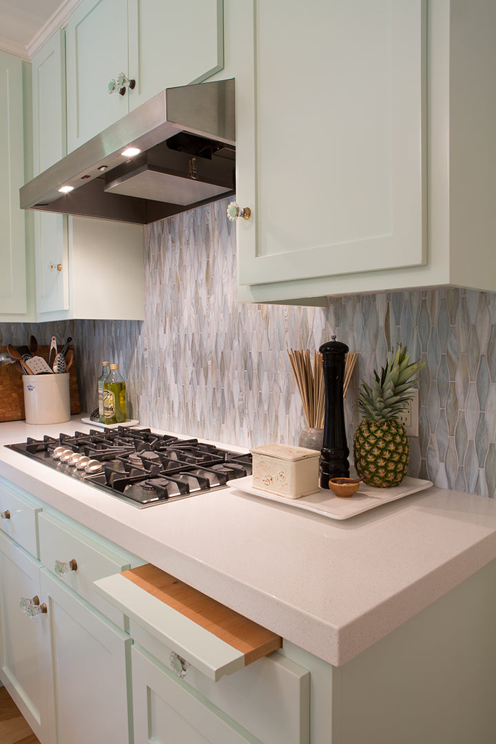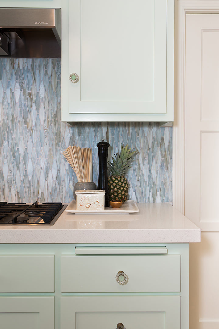 Agate Taiko in Lucca Silk on kitchen backsplash.