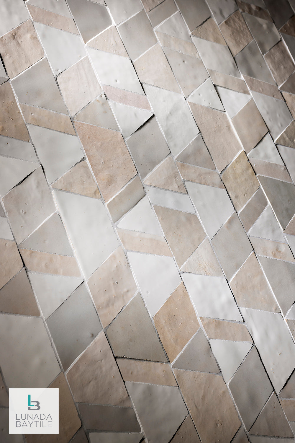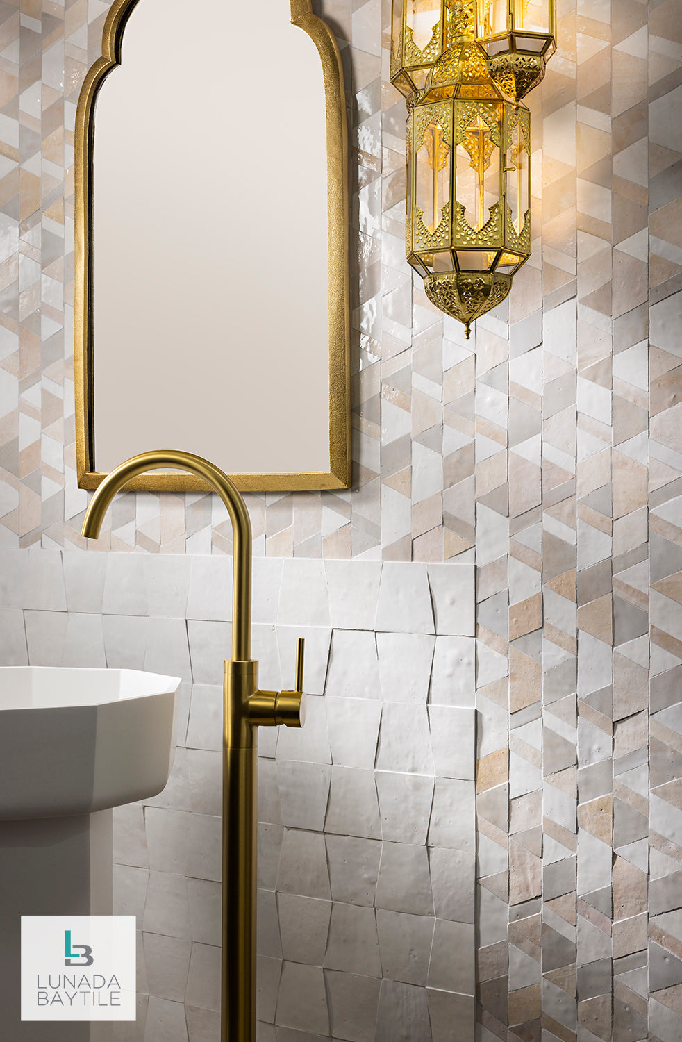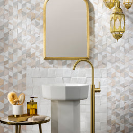 This bathroom tile expands the open, airy oasis that also feels like a private location for rejuvenation. The mosaic pattern of hand-crafted ceramic tiles uses several traditional, geometric Zellige shapes mixed and matched with an Art Deco and Mid-Century influence.