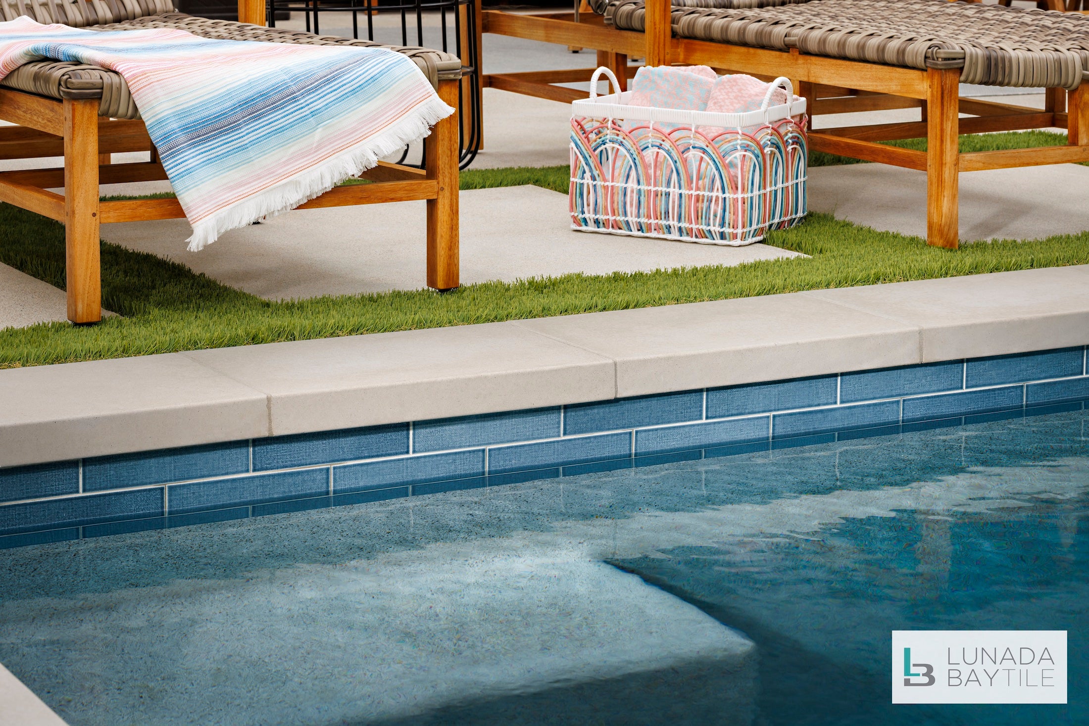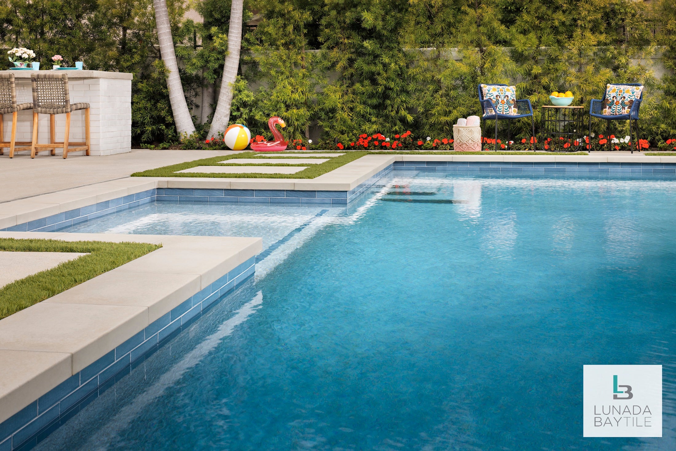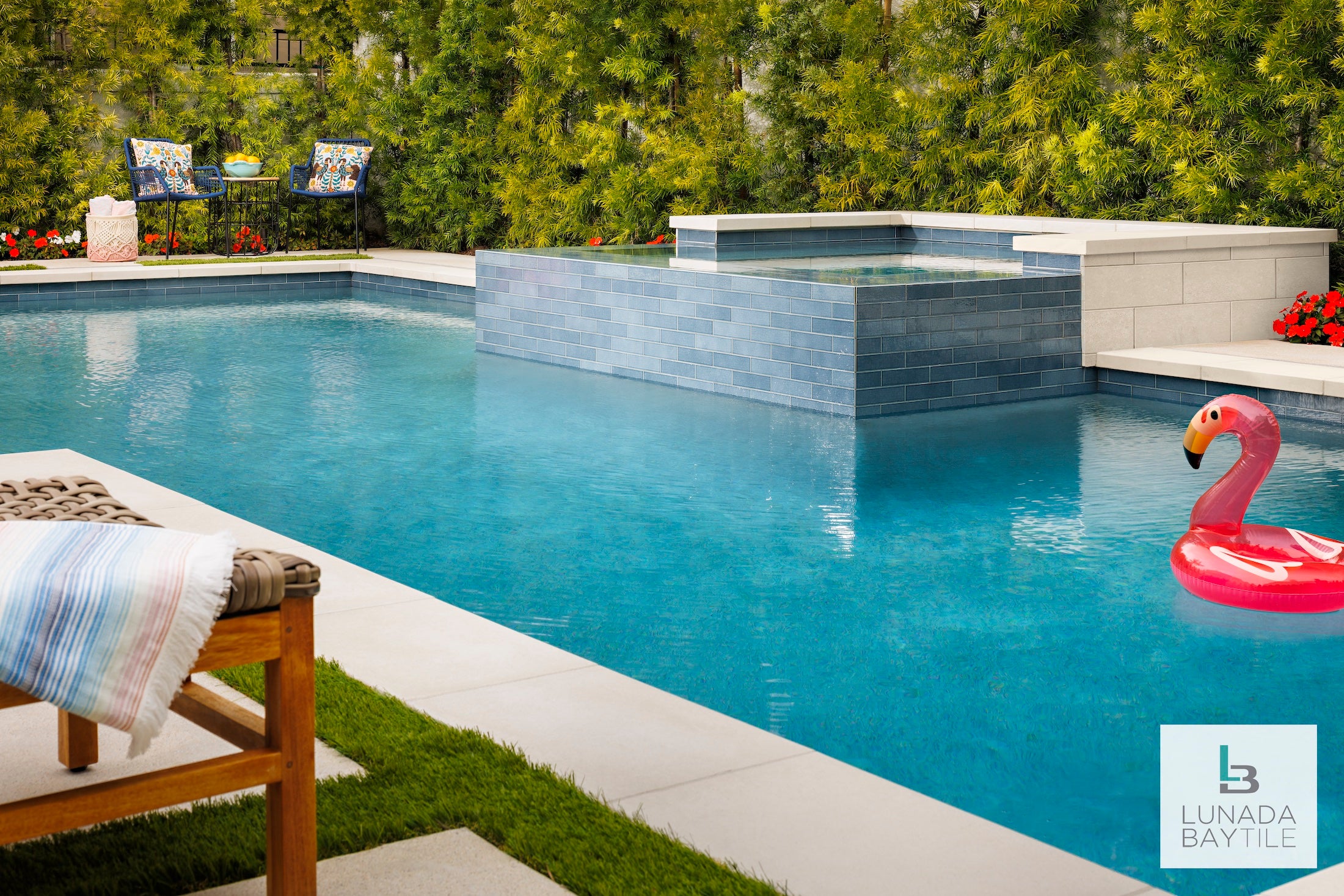 Pool waterline and spa features our subtle linen textured ceramic tile as focal point of this gorgeous backyard oasis.