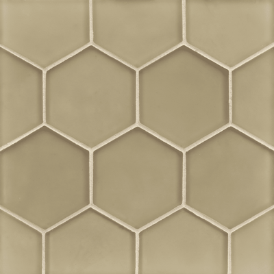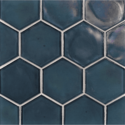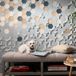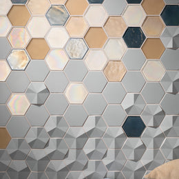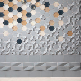 The mixed-media blend of textures and finishes is created by two types of materials. Concrete hexagons are Contourz Fanfare Hex & 4” Hex in Urban Mist. Glass hexagons are Flux 4” Hex in Cottage Blue Pearl, Crystal Pearl, and Latte in both Pearl and Silk finishes. The field tiles surrounding this multi-color/material panel is Contourz 6x9 and Zen Break A & B, also in Urban Mist.