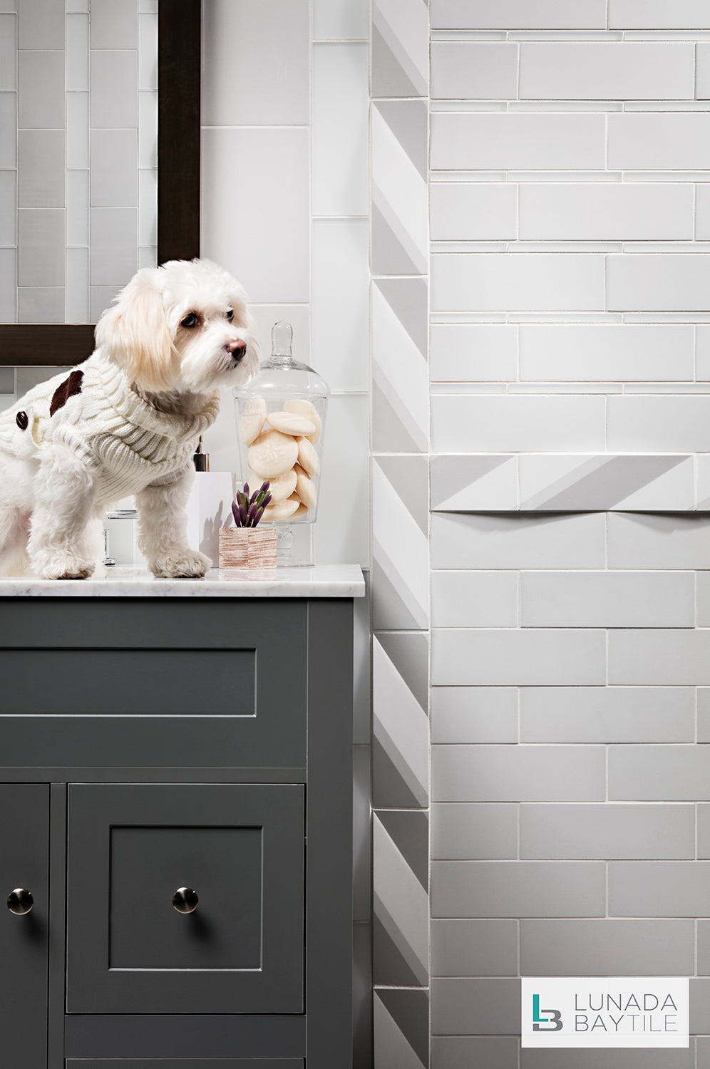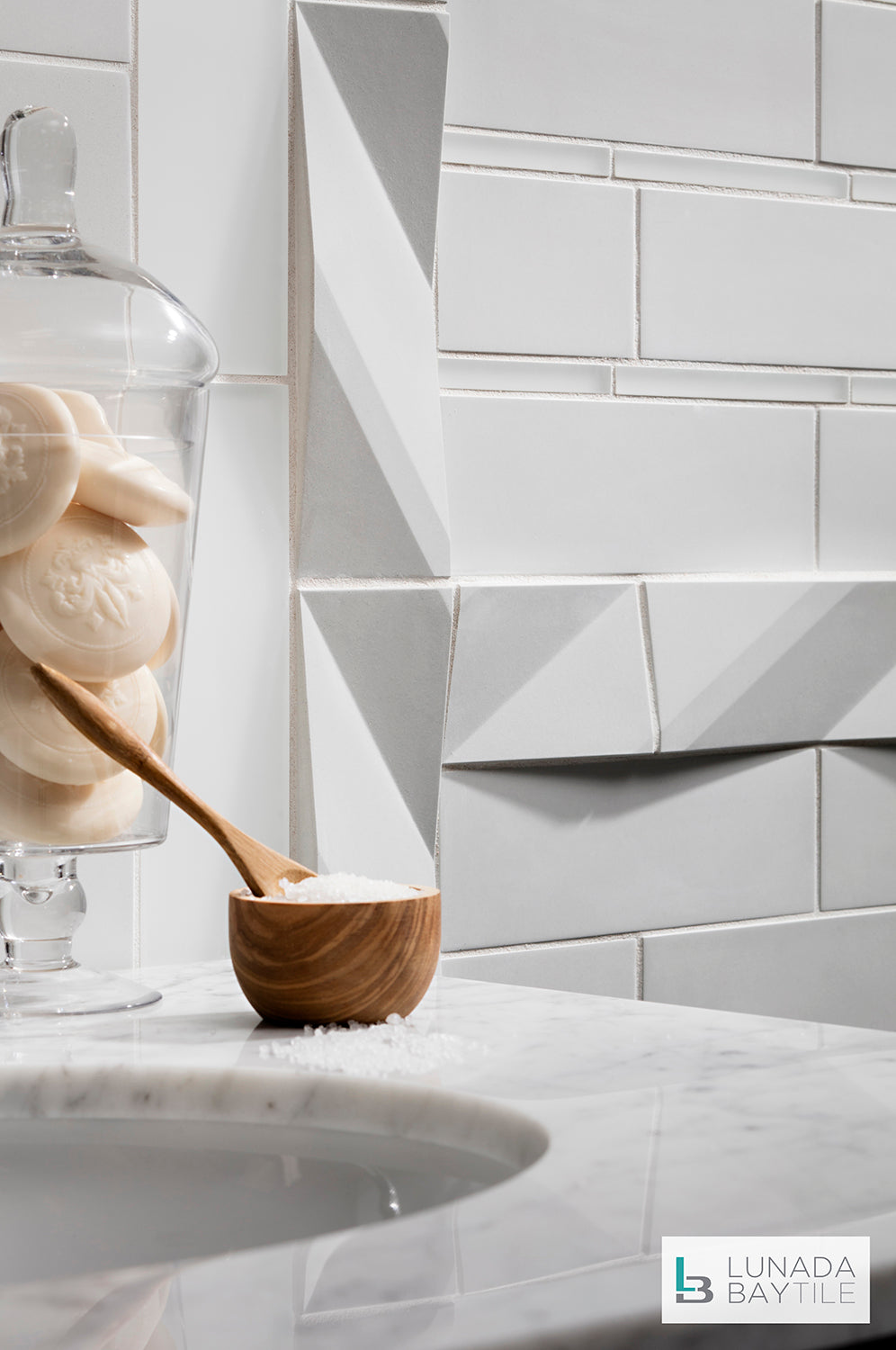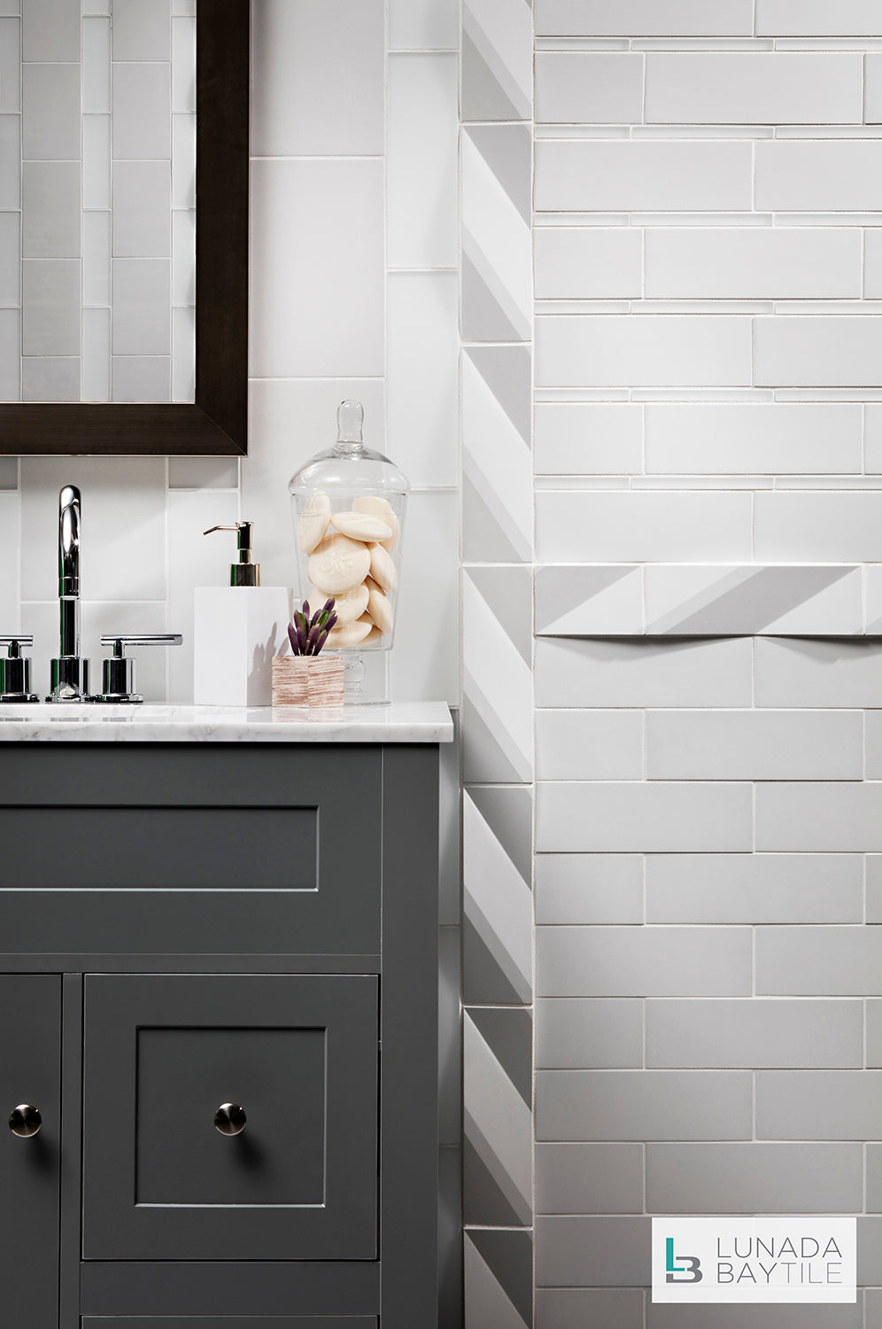 Engineered and crafted Contourz concrete tiles on bathroom wall. Pattern: Zen Break and 3x9, both in the color Sea Salt.
