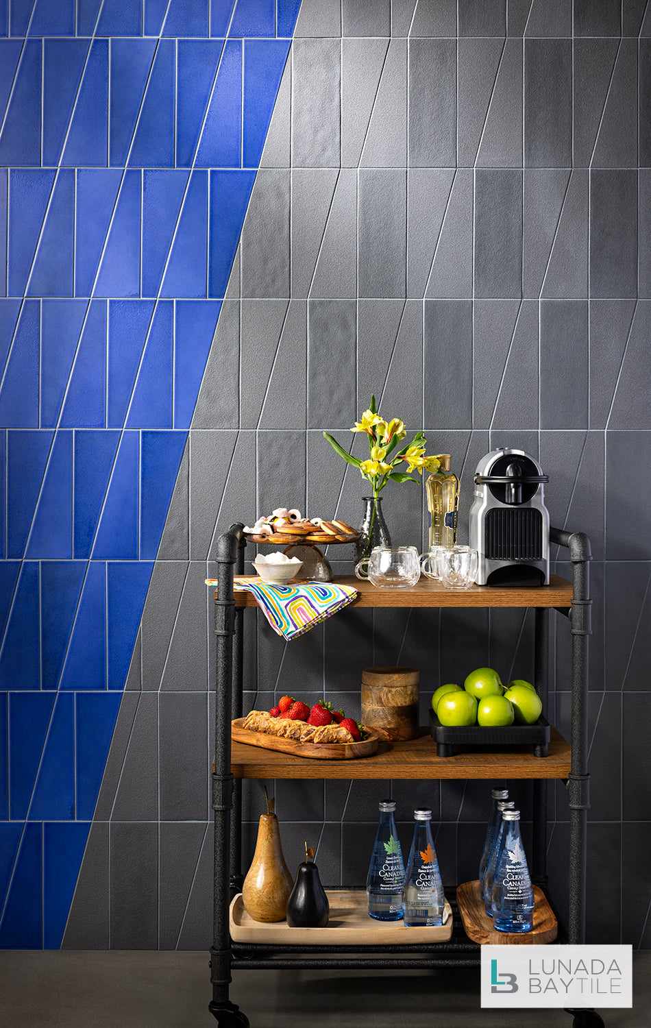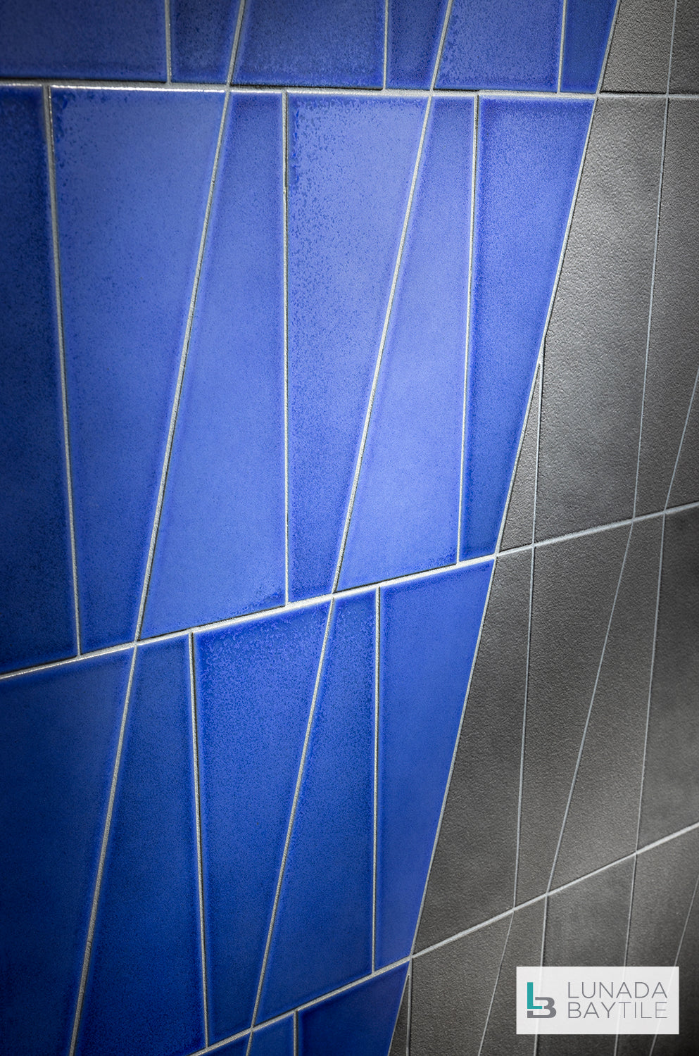 The Duet pattern, from the ceramic Graphite series, creates a myriad of lines and patterns upon this floor to ceiling wall, seen here in both Black Iron and Klein Blue colors.