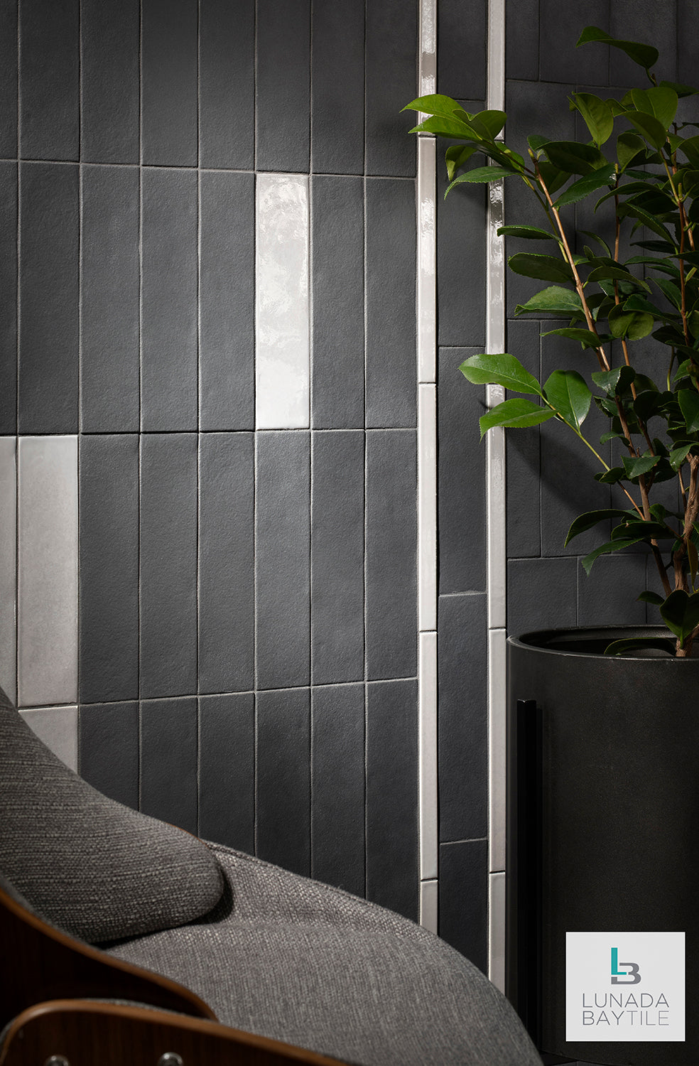 Graphic wall mixing pieces from two ceramic series: Graphite 2 ½ x 9 ½ and 3 ½ x 9 ½ in Black Iron with Shinju Smooth and Shinju Liners in Moonstone.