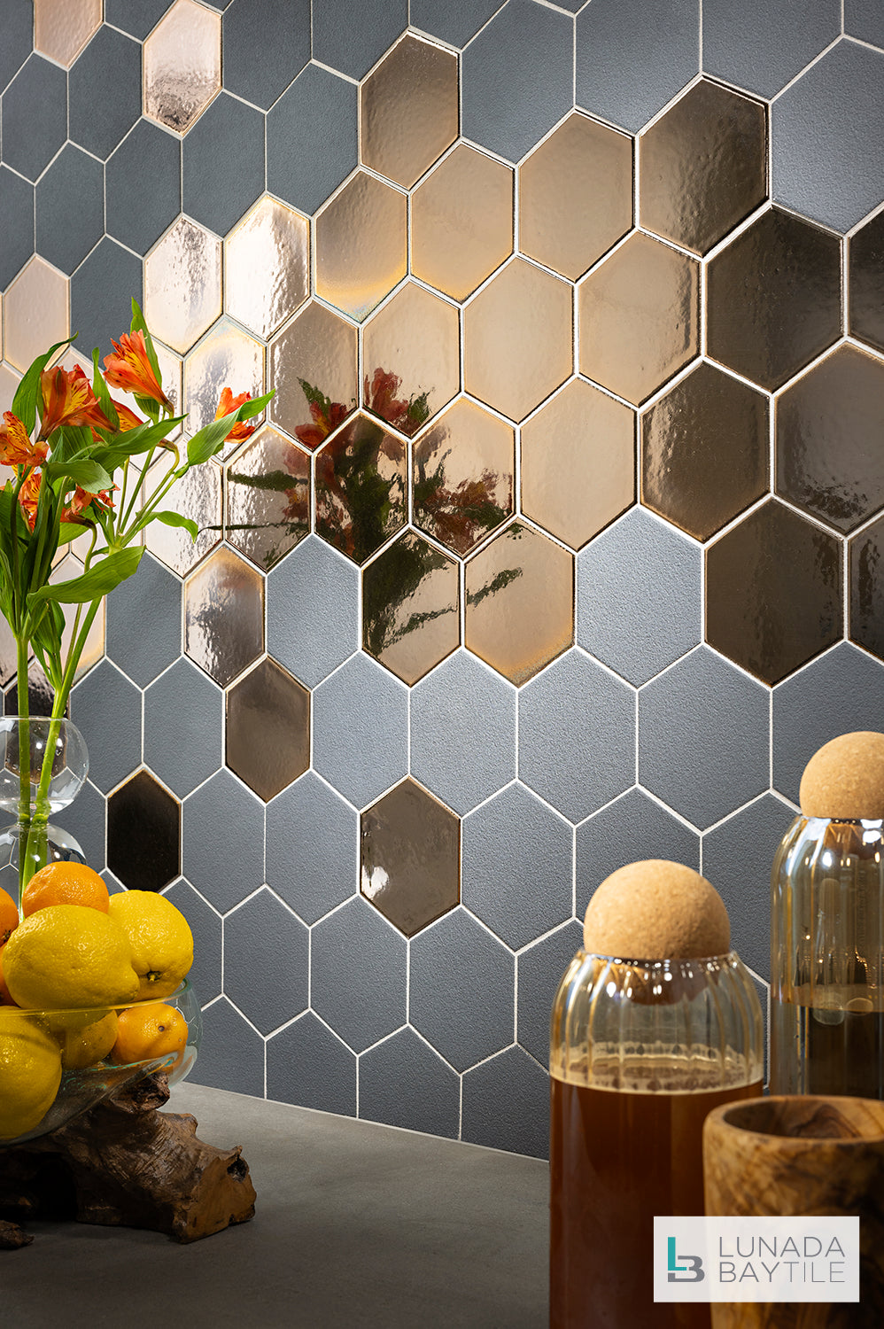 This ceramic tile backsplash exudes an energizing yet grounded blend of the Graphite 4" Hex in metallic Molten Bronze and matte Black Iron bring a great way to inspire the day.