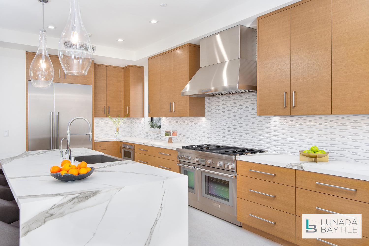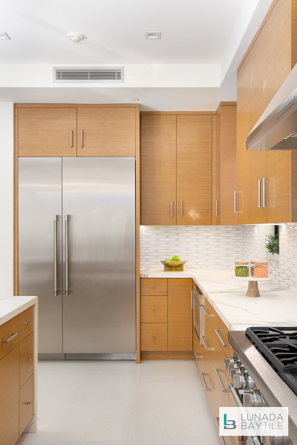 The crisp white, high-fired, glossy glaze adds brightness to the room in the dimensional, hand-crafted Keel shape adds an engaging layer of texture to this kitchen backsplash.