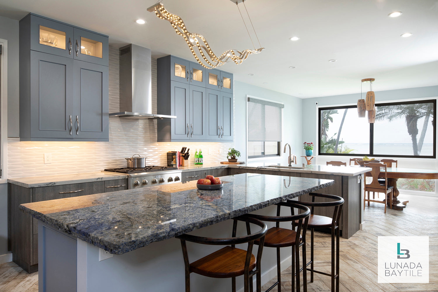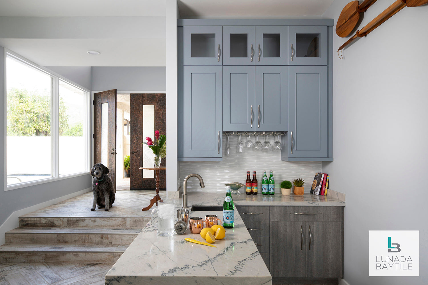 The dimensional Keel pattern creates a rhythmic texture to the wet bar of this sunken great room and the nearby kitchen backsplash, creating a space in which to relax and entertain.