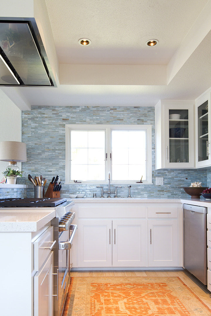 Agate 1x4 Brick in Lucca Pearl on kitchen wall.