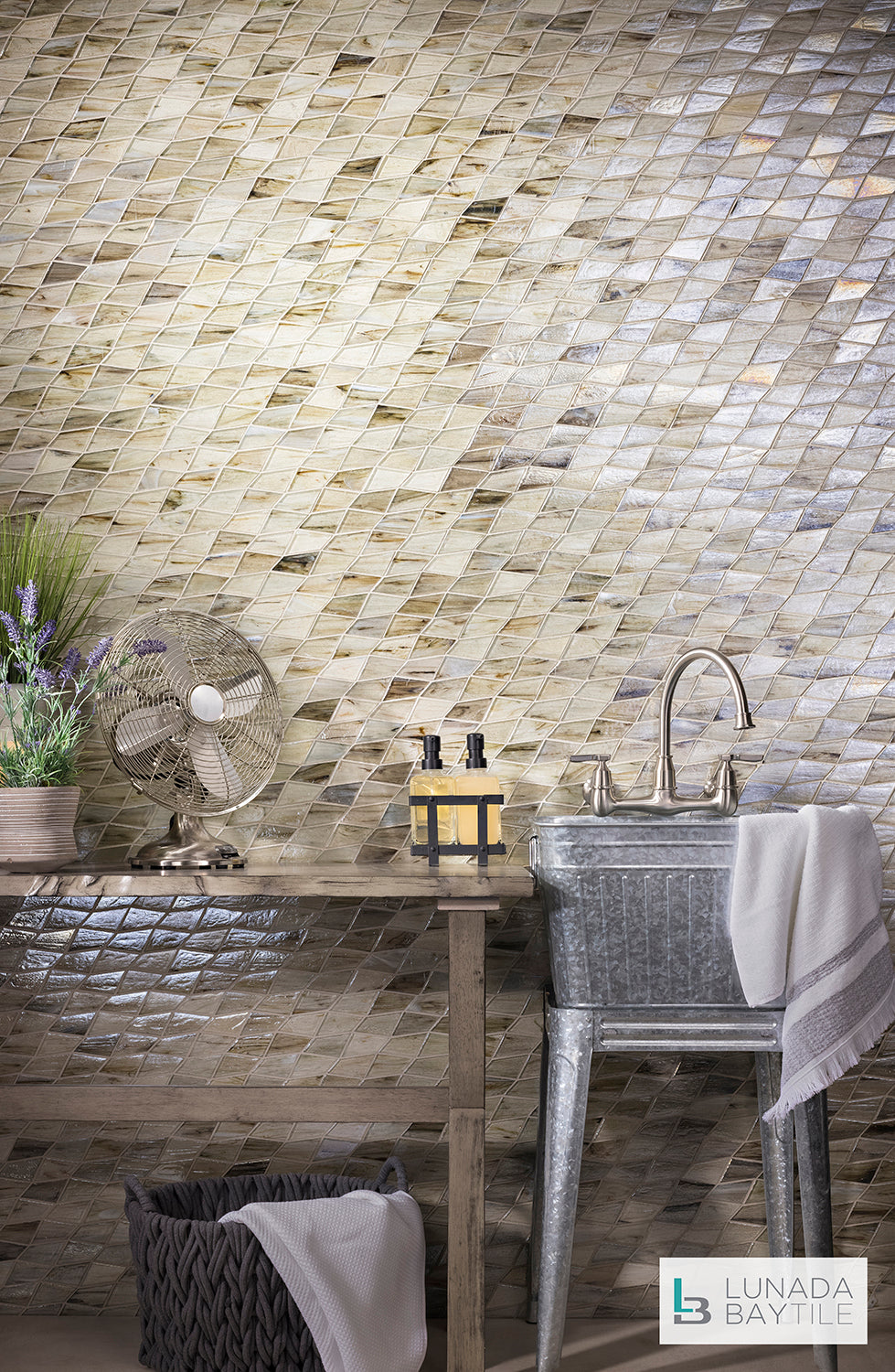 The unique, irregular quadrilateral tile shape steps away from the standard rectangular shape to create visual playfulness and an energetic freshness. This laundry room wall utilizes the Flicker color from Lapis in Pearl finish.
