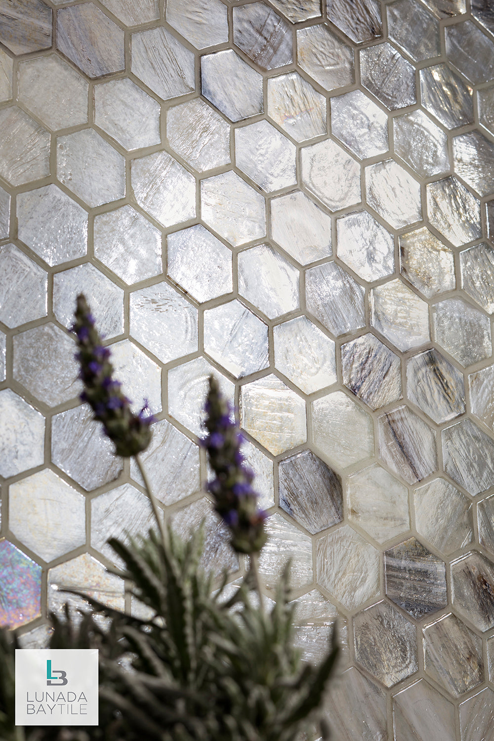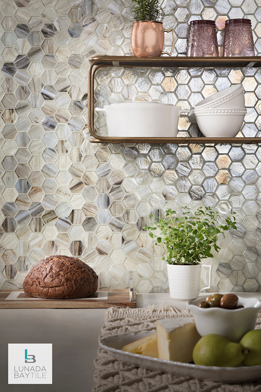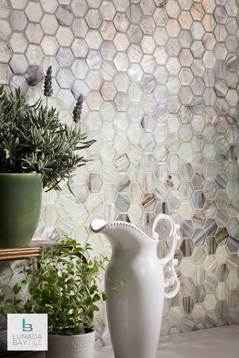 Iridescent hand-crafted glass mosaics in 2” Hex pattern from our Luce series brighten this kitchen space with a lovely neutral color that changes feeling with the day’s changing light, from morning coffee to late night snack. Seen here in our Sugar Cake color in Pearl finish.