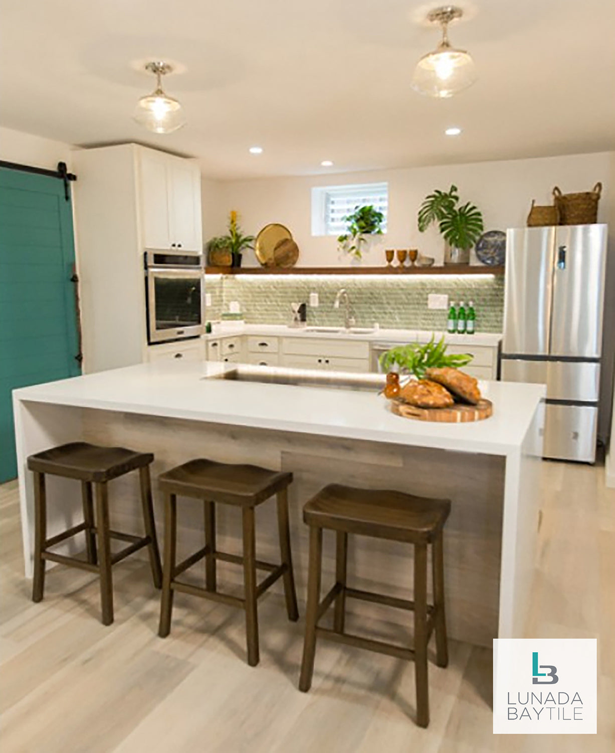 Shapes and colors can bring a feeling of nature indoors as seen with our patented Feather shaped tile from our hand-crafted glass series, Luce. Used on this kitchen backsplash in our Bamboo Garden color in the matte Silk finish by the DIY network show Aloha Builds.