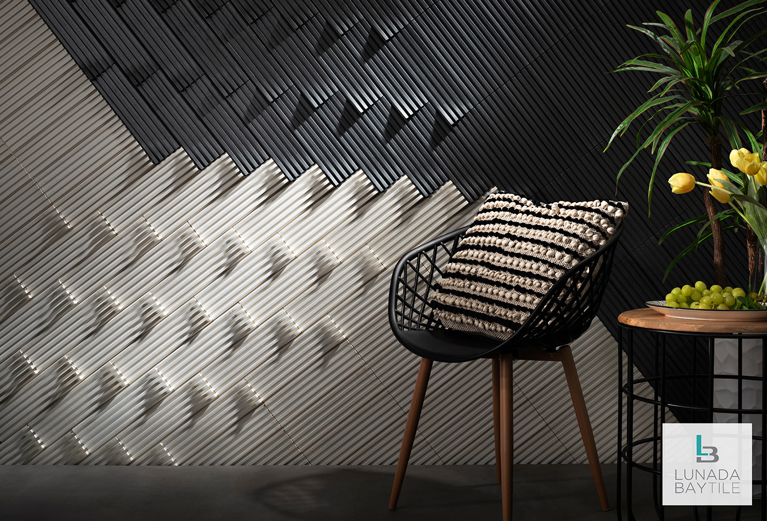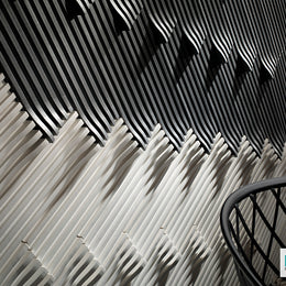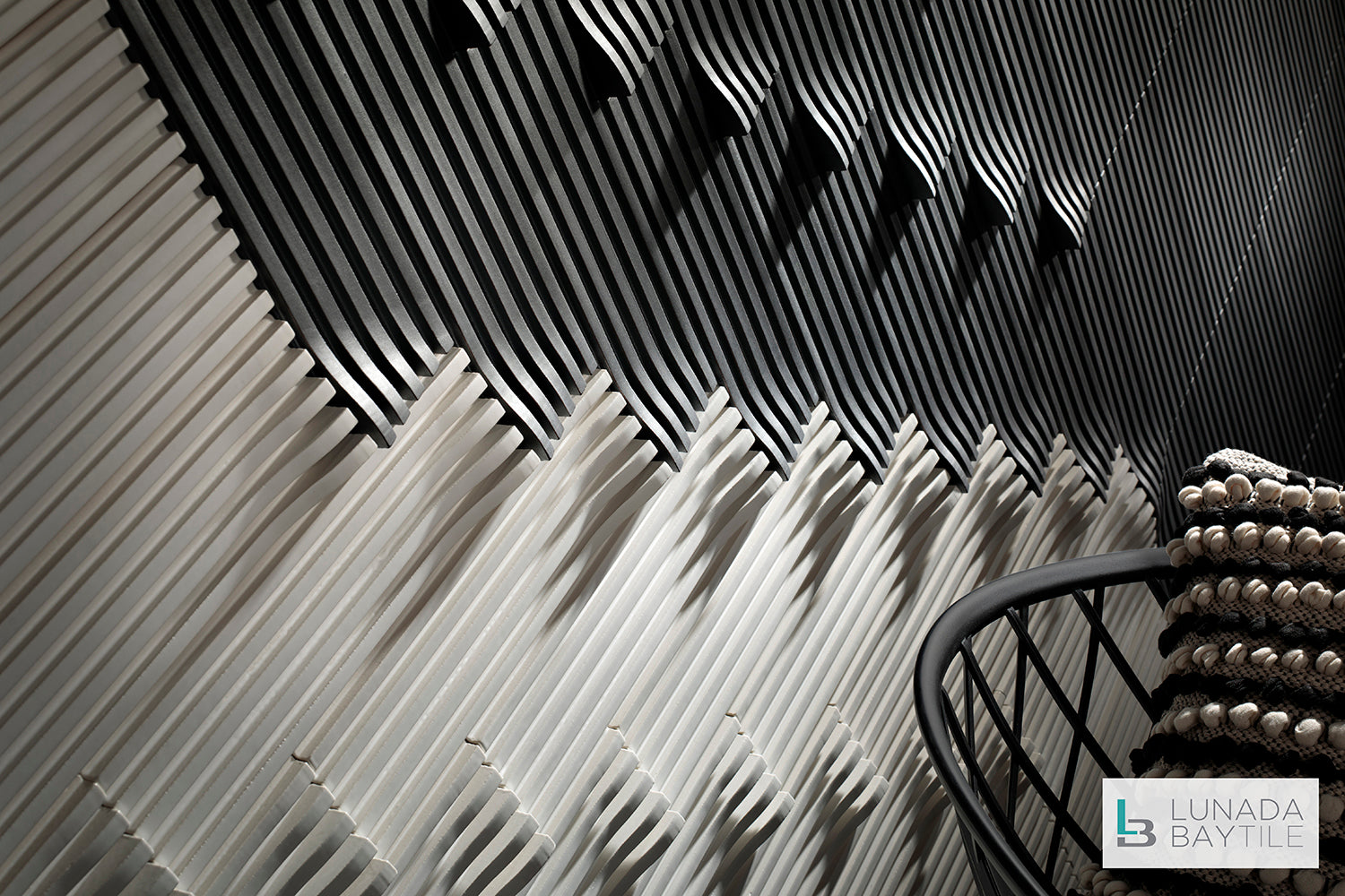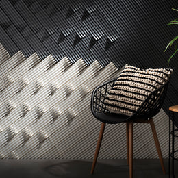 The three-dimensional ceramic tiles from the Momentum series feature sculptured lines of dramatic variation. An array of textures and patterns are possible through a single shape and color, or with a blend of shapes and/or colors puzzled together – the journey is yours to create.