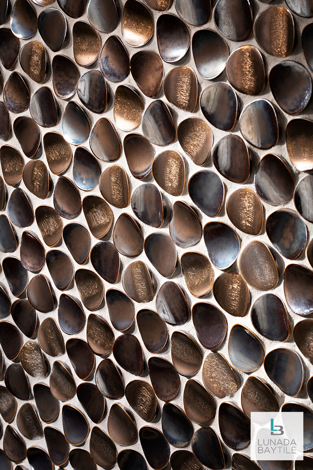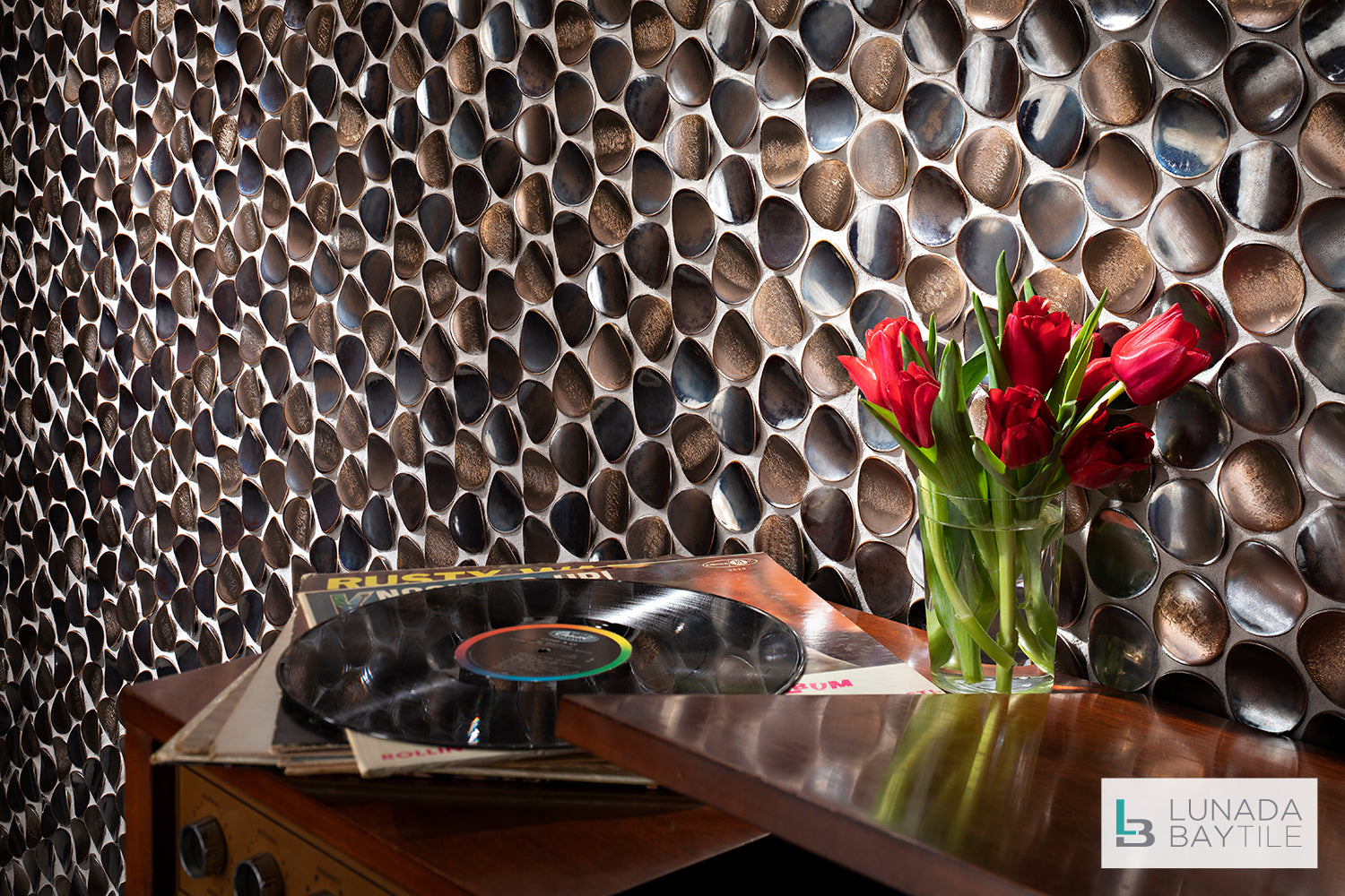 The metallic glaze on these dimensional, hand-sculpted tiles from the Namibia series brings a warmth and texture that engages the senses and creates a beautiful room for gathering.