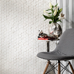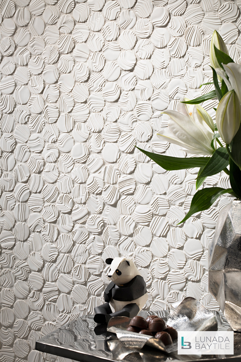 The tiles created at Lunada Bay Tile are designed to work alone or combined with any of our tile series for endless opportunities for your personal design. Here, Namibia Round Ripples in White Sand and Shinju Mirai Tent in Kumamoto create a wonderful blend of sophistication, playfulness, and artisanal design.
