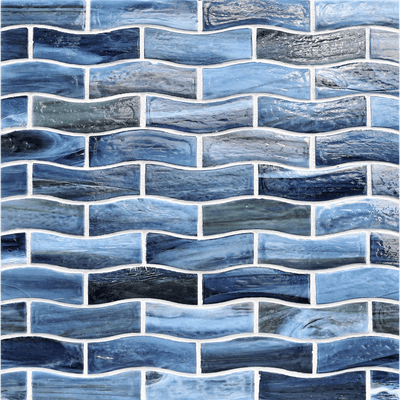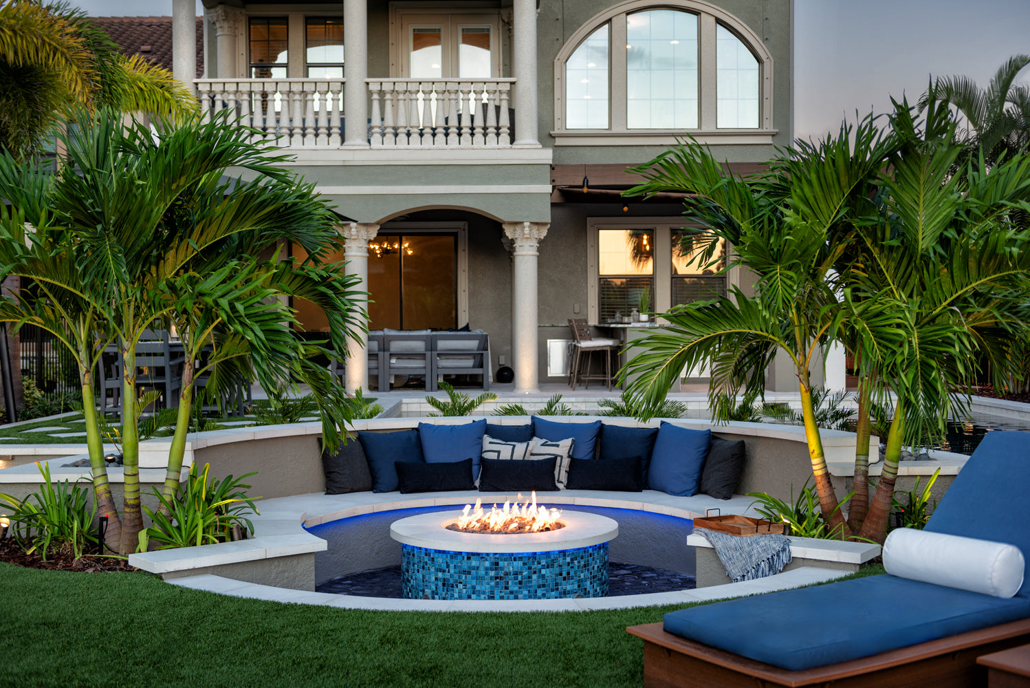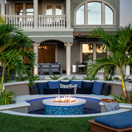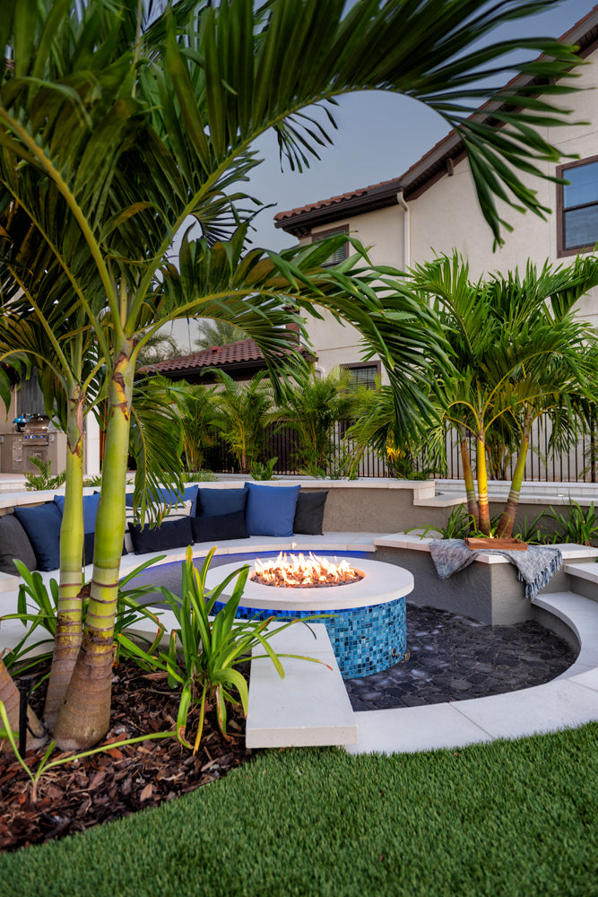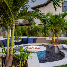 As evening falls, a firepit with our beautifully crafted and vibrant glass mosaics becomes an inviting spot for gatherings. The blue glass tiles bring beautiful pops of color among the surrounding lush green landscape.