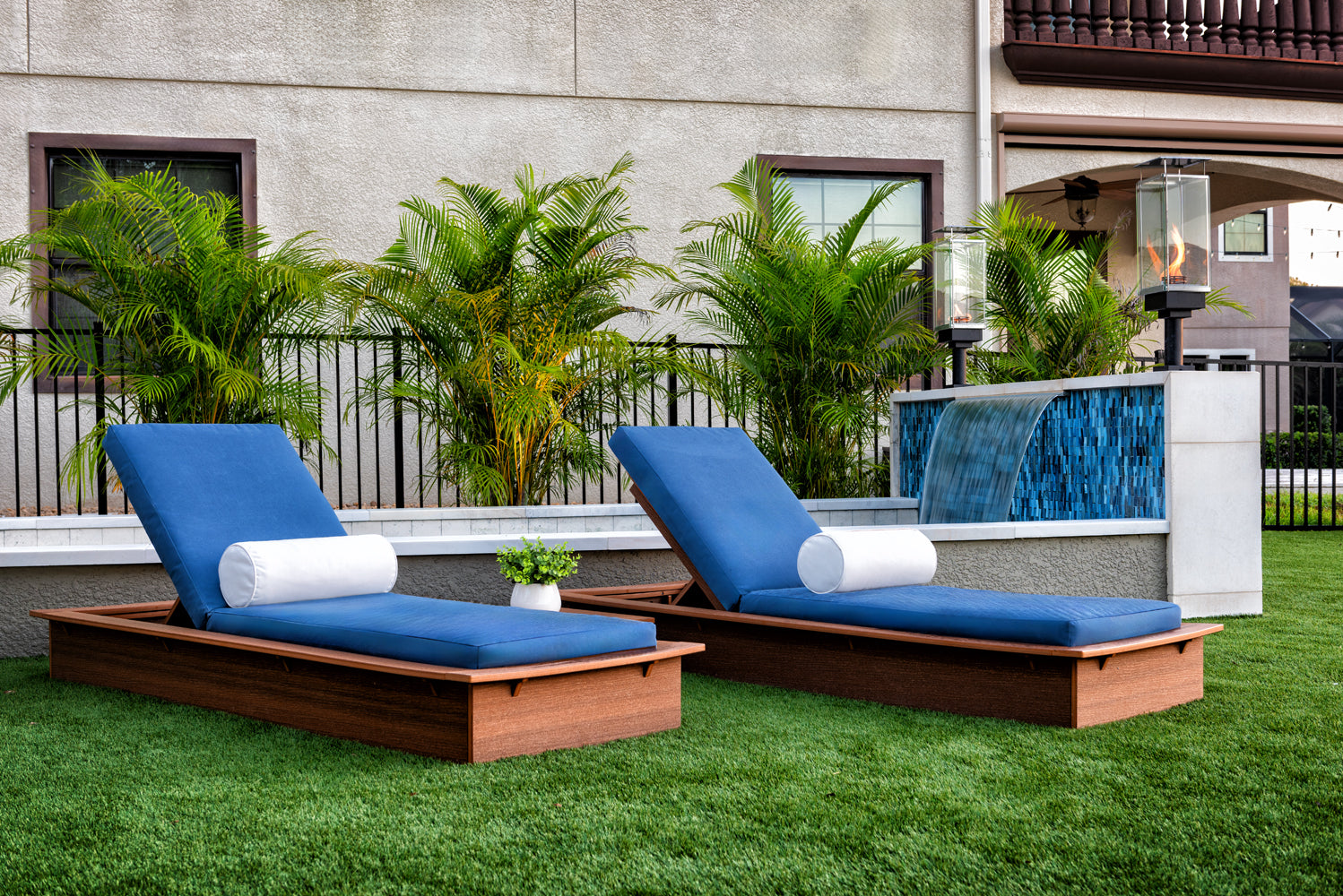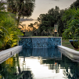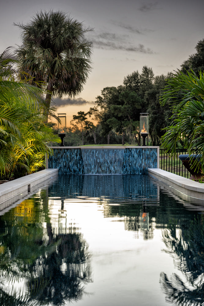 Blues and green are abundant throughout this nature-inspired oasis. The pool is a stunning focal point with pearlescent glass that playfully reflects the light of the mid-day hours. Blue hand-crafted tiles in a wavy pattern emulate the cascading water at the pool’s edge and harmonize beautifully with the water, enhancing the luxurious feeling of the space.