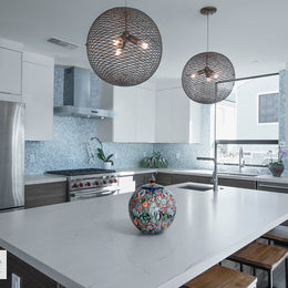 Beautiful kitchen in the Lucia Container House in Redondo Beach, CA features the three-dimensional Origami Mosaic Nami pattern in Ivory Pearl. The dimensional hand-crafted glass mosaics add to the texture and light within the room.