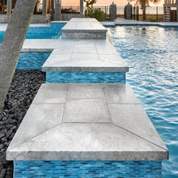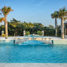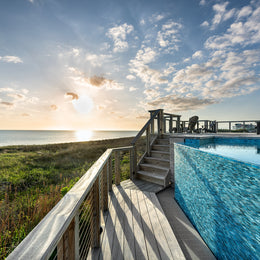 Whether you're taking a refreshing dip or lounging by the water, this enchanting retreat is a true celebration of nature’s artistry! The beautiful hand-crafted glass mosaics from our Agate series covering this pool and spa breathe life into this outdoor space. A delightful dance of blues and soft greys swirls within the glass perfectly capture the essence of coastal living by echoing the vibrant colors of the nearby ocean waters and the sky’s reflections on the pool's surface. Nestled throughout this Outer Banks, North Carolina home, the glass tiles harmonize beautifully with their nature-inspired colors and finishes, creating a serene oasis that invites you to relax, unwind, and soak in the beauty of the surroundings.