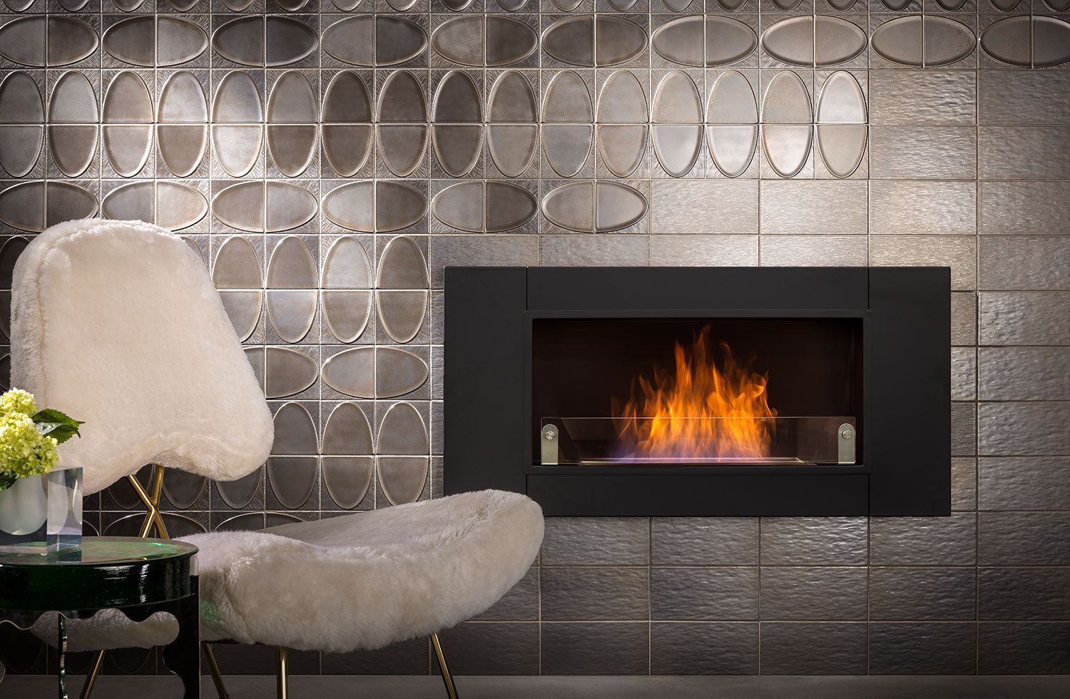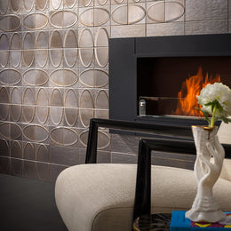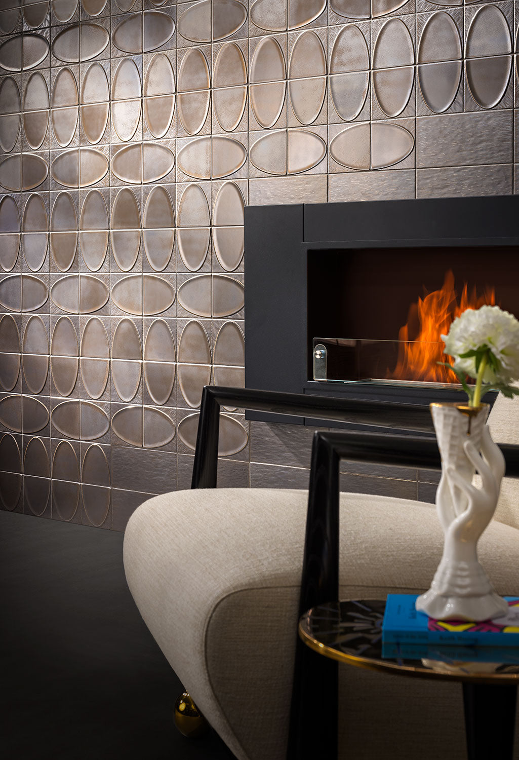 The Aged Bronze glaze color bathes the room in a welcoming warmth, transforming the space into a comfortable, soothing sanctuary alongside the fire. The rich metallic hue with moderate variation enhances any environment, whether it’s a cozy residential living room or a lofty commercial space. The use of these tiles around the fireplace brings a sophisticated aesthetic appeal that also contributes to a calming and inviting atmosphere, making the space feel both luxurious and approachable.