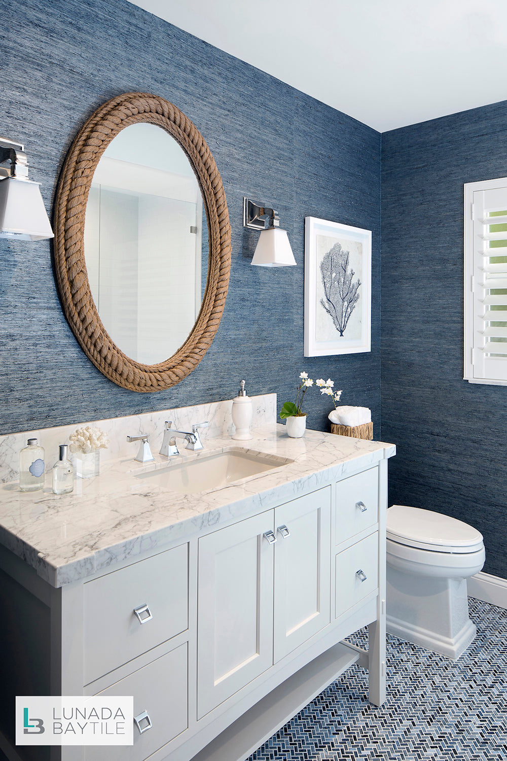 Shibui 1/2x1 Herringbone Sevres Blue Silk displayed on a guest bathroom floor.