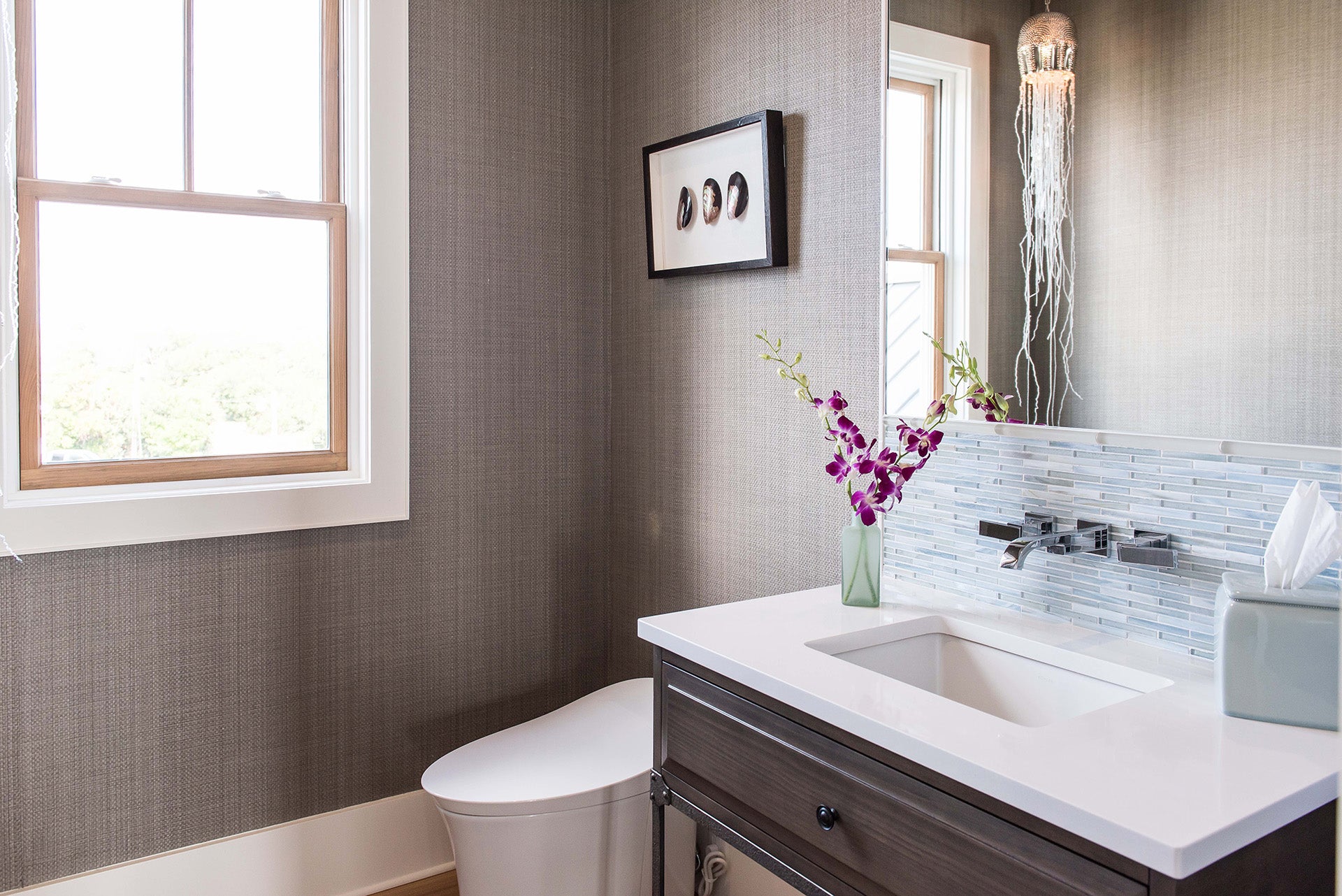 Shibui ½ x 4 Brick in Zinc Silk brings cool pop of color upon this backsplash.