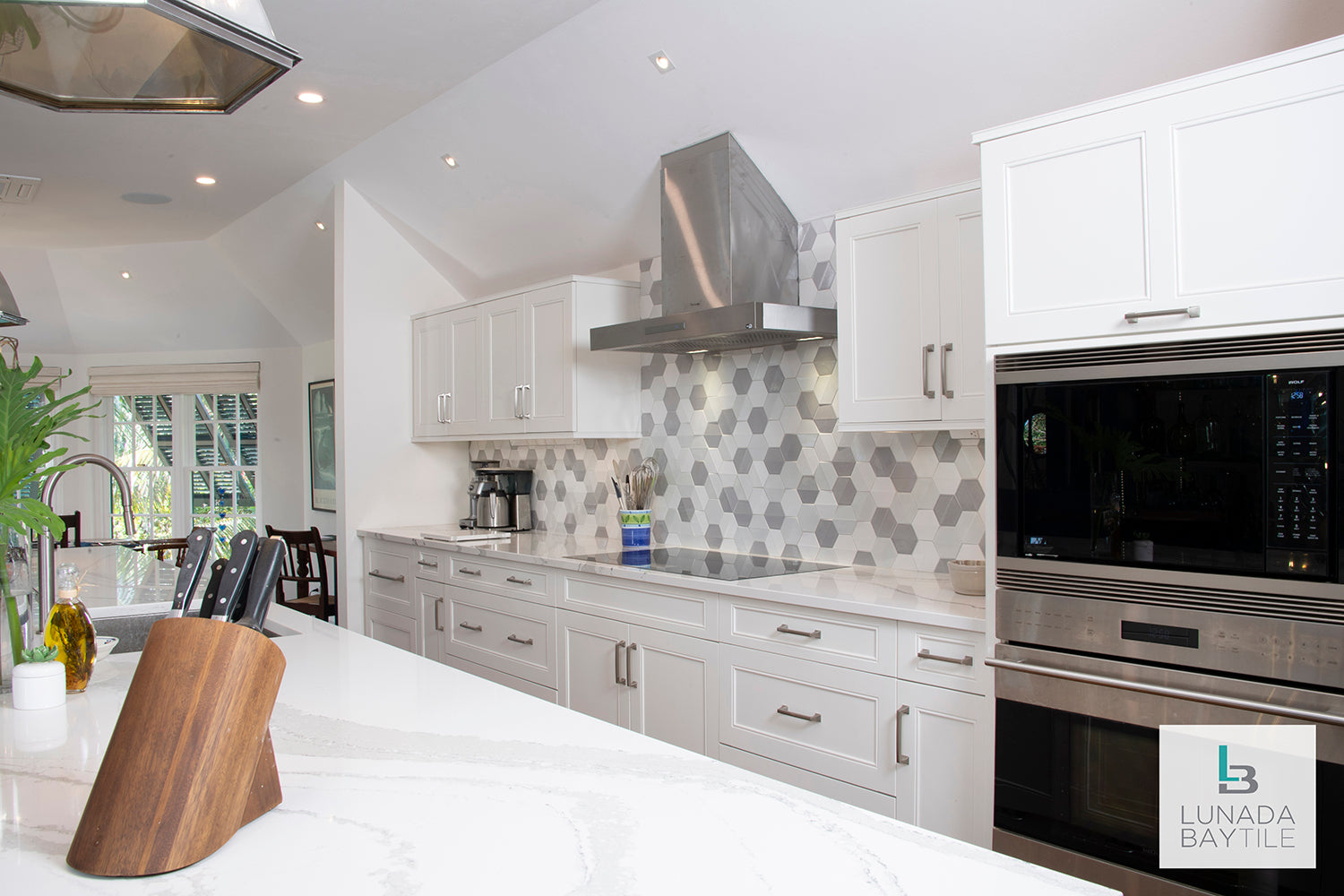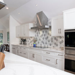 Shinju Crest on kitchen backsplash in blend of the colors Kumamoto, Kushi & Moonstone.