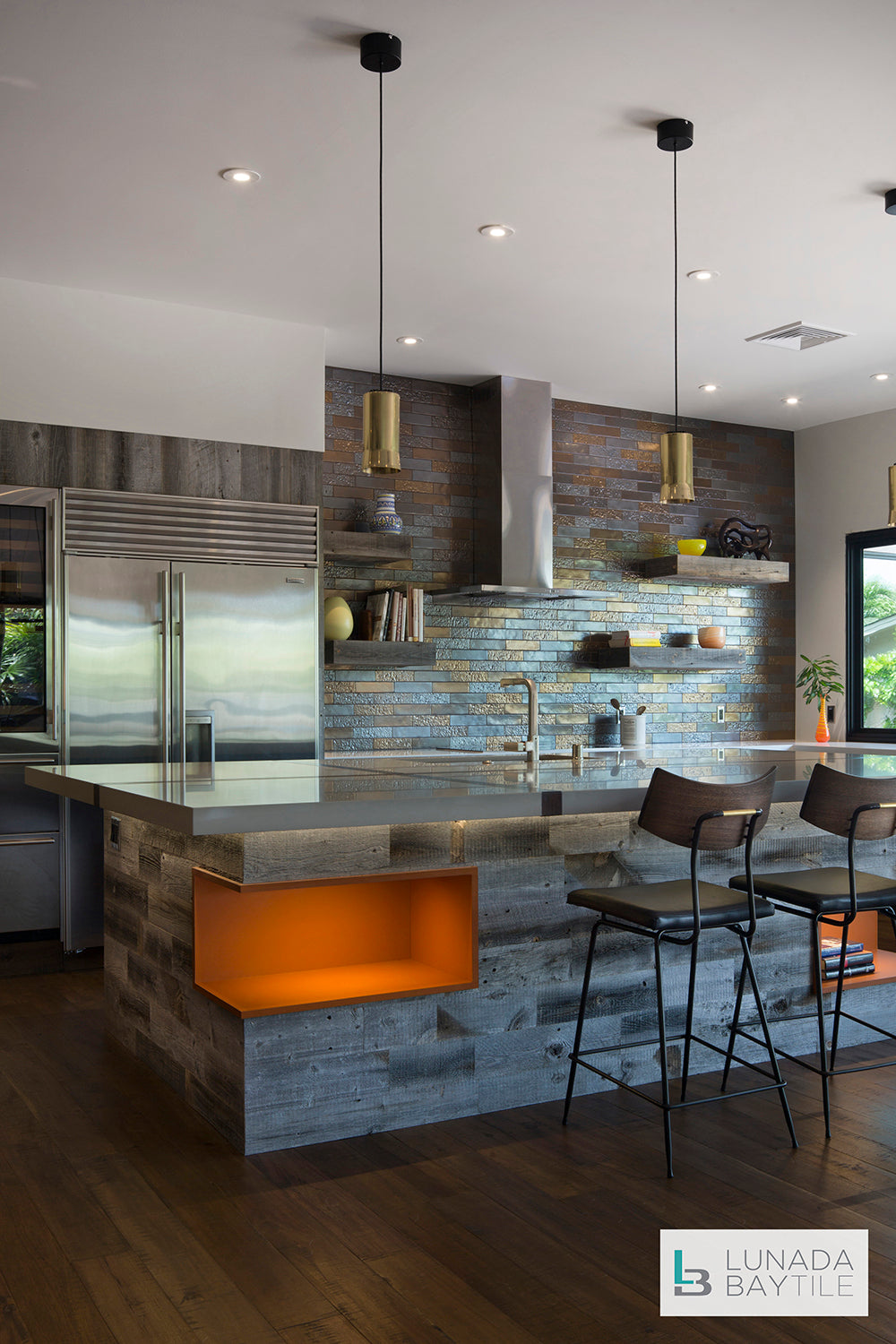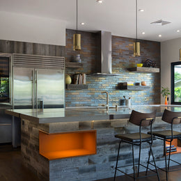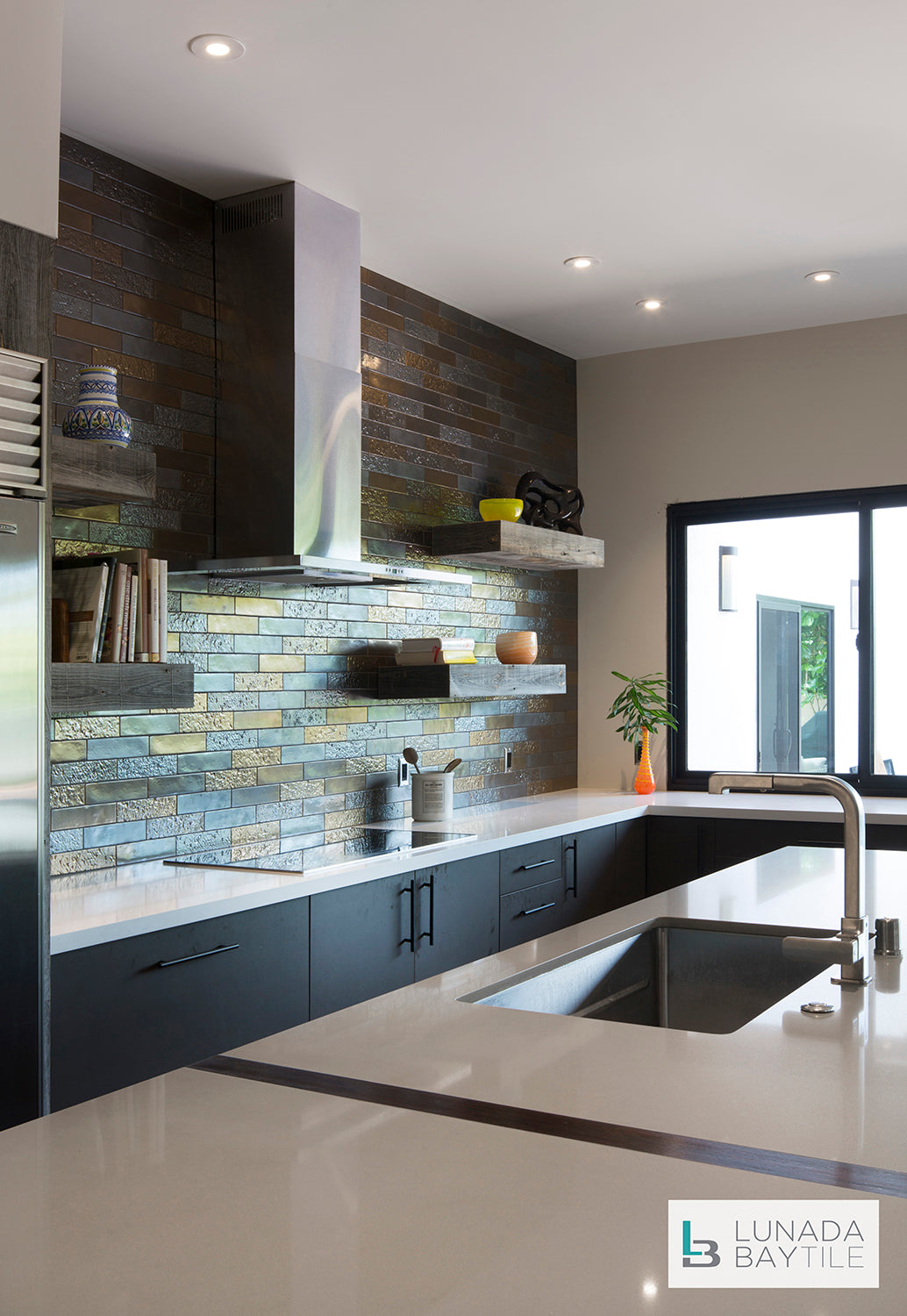 The Pacific color glaze on the Shinju Reef pattern covering the backsplash and back wall feels right at home in this modern kitchen showcasing both natural materials and metallic finishes.