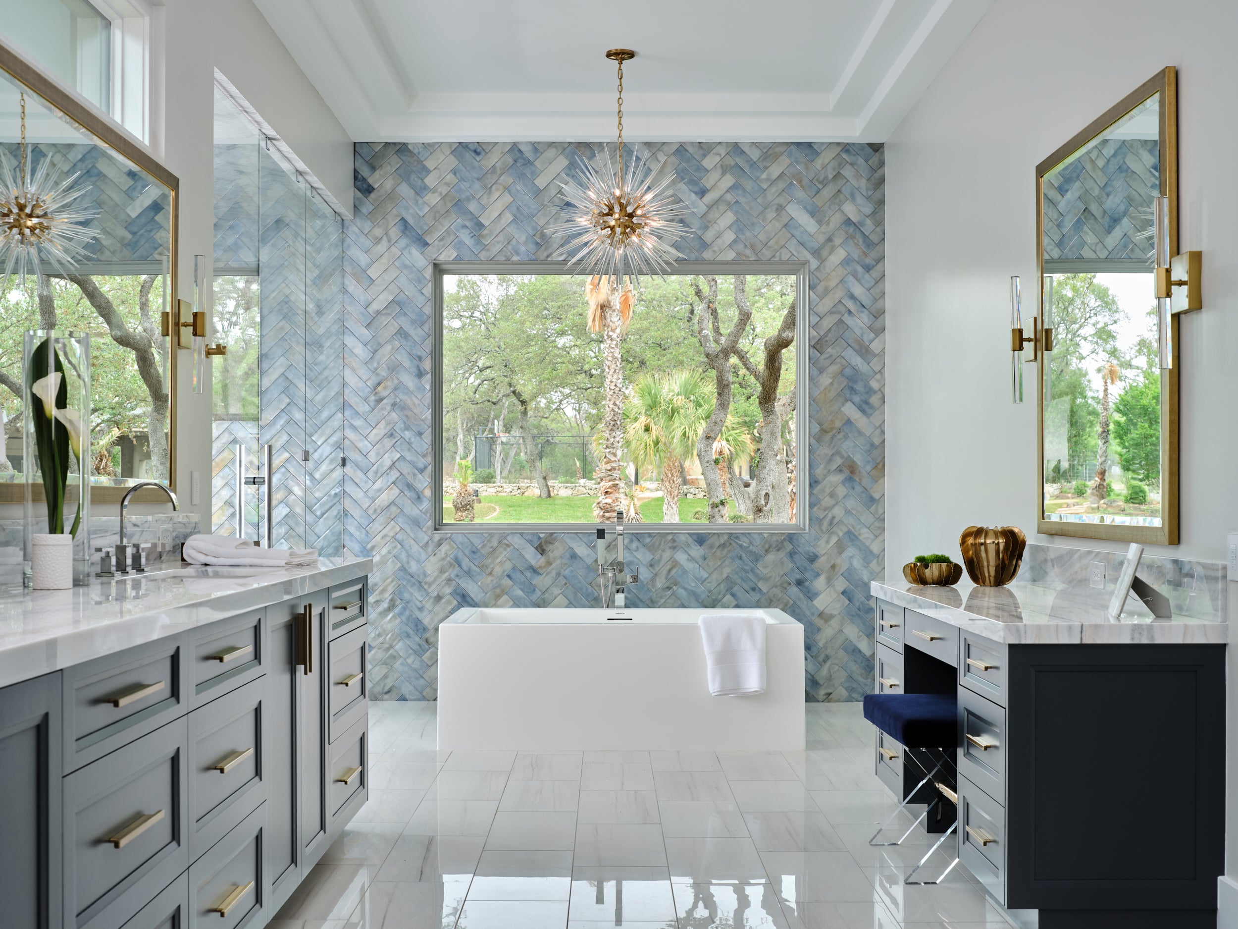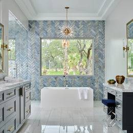 Sonaré tiles harmoniously contribute to the serene elegance of this space and wonderfully frame the view outside. (Tone pattern in Aura and Spring Water.)