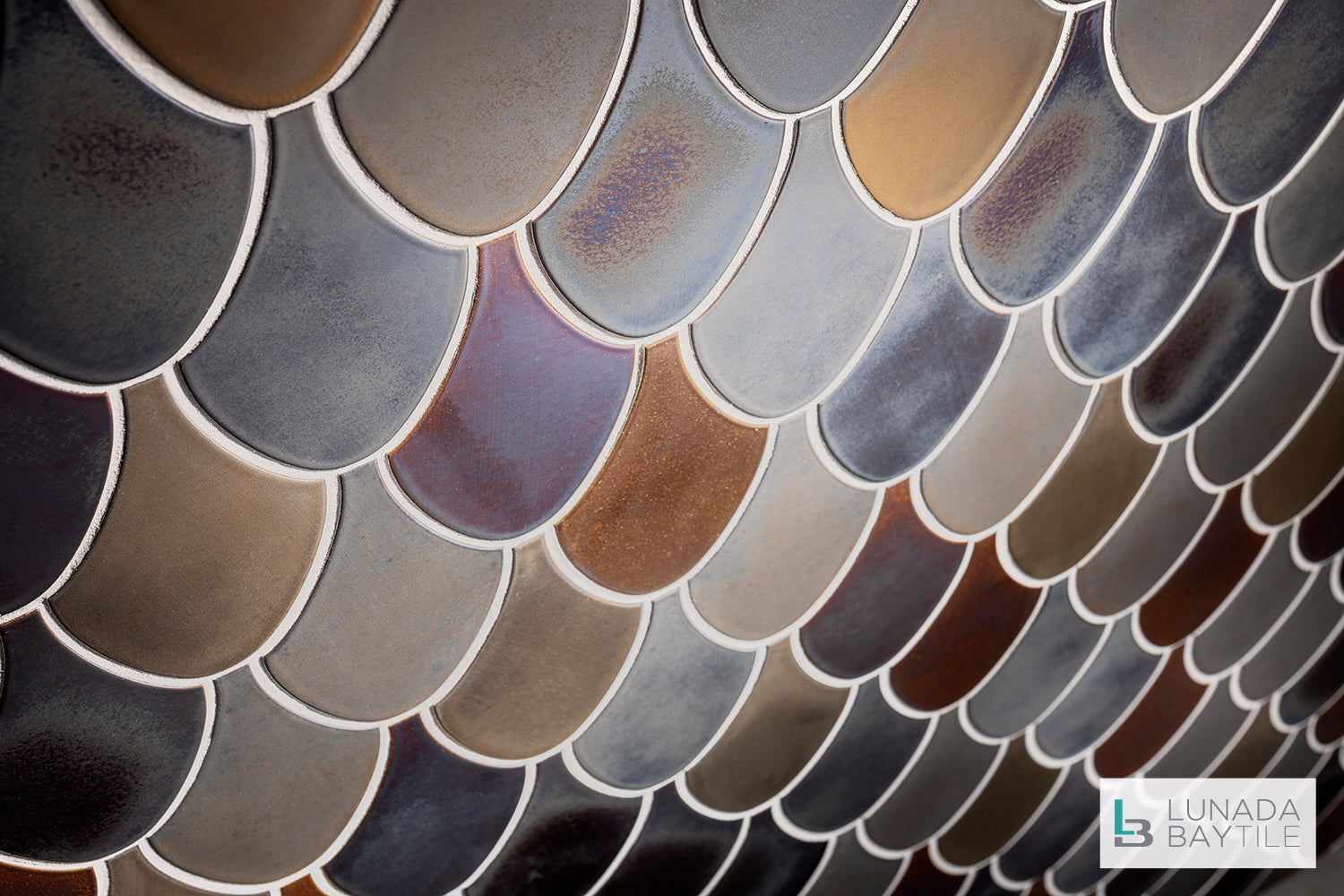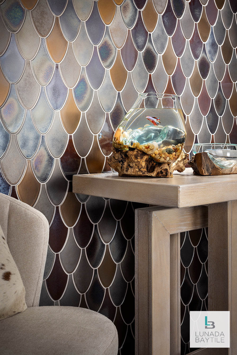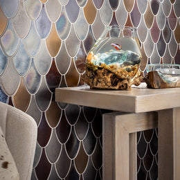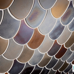 Handcrafted Shinju Stingray ceramic tiles upon this wall are a random blend of Pacific & Olympia colors, giving both of these metallic glazes a rich and lush range to the tone and feeling of this space.