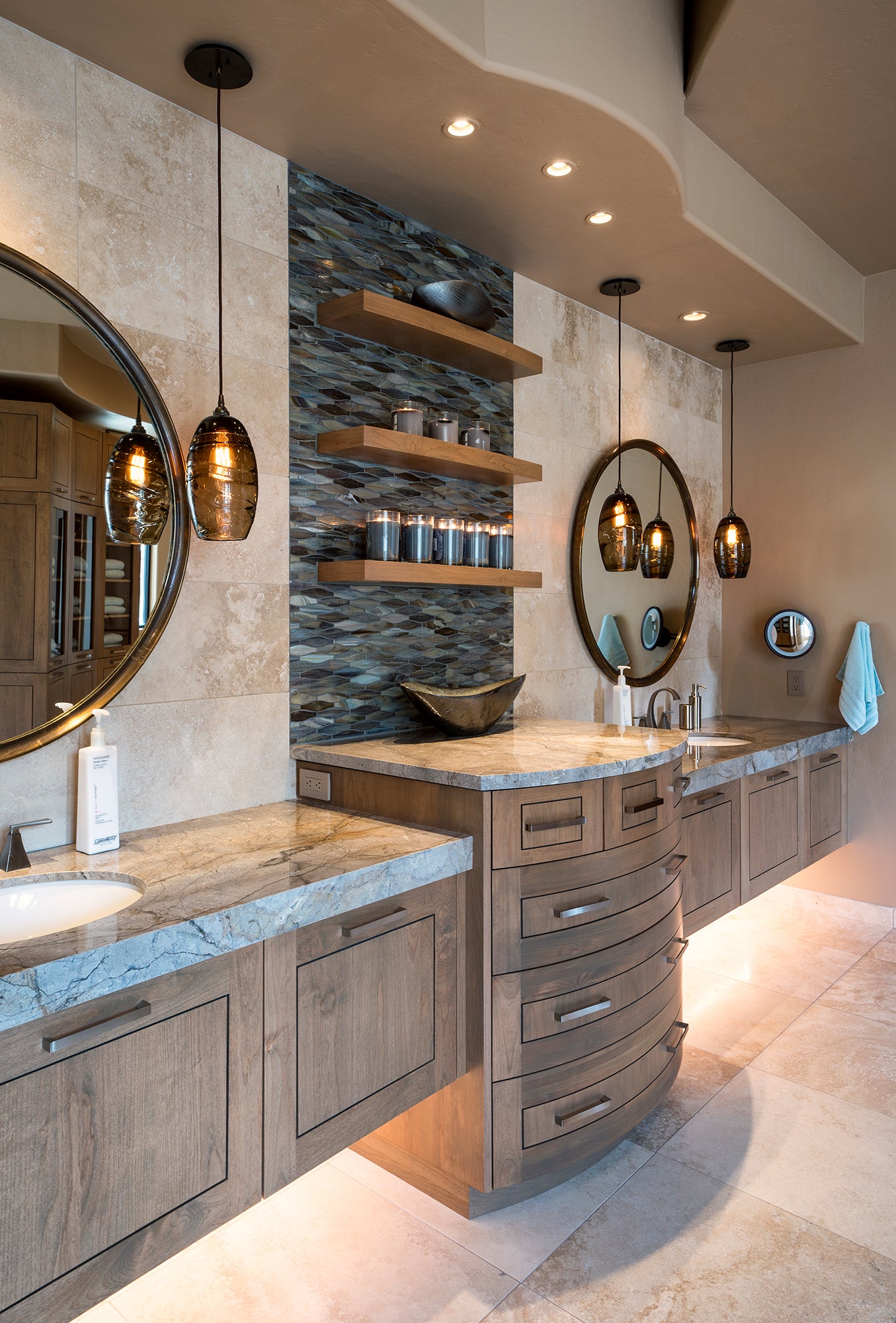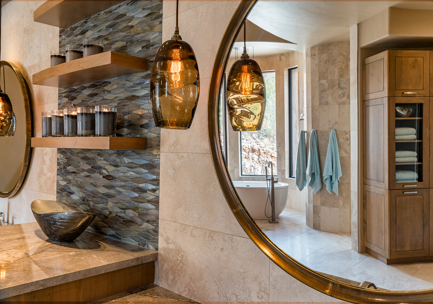 The reflectivity and handcrafted nature of the glass mosaics and handblown lighting pendants resonate against the stone of this bathroom suite.