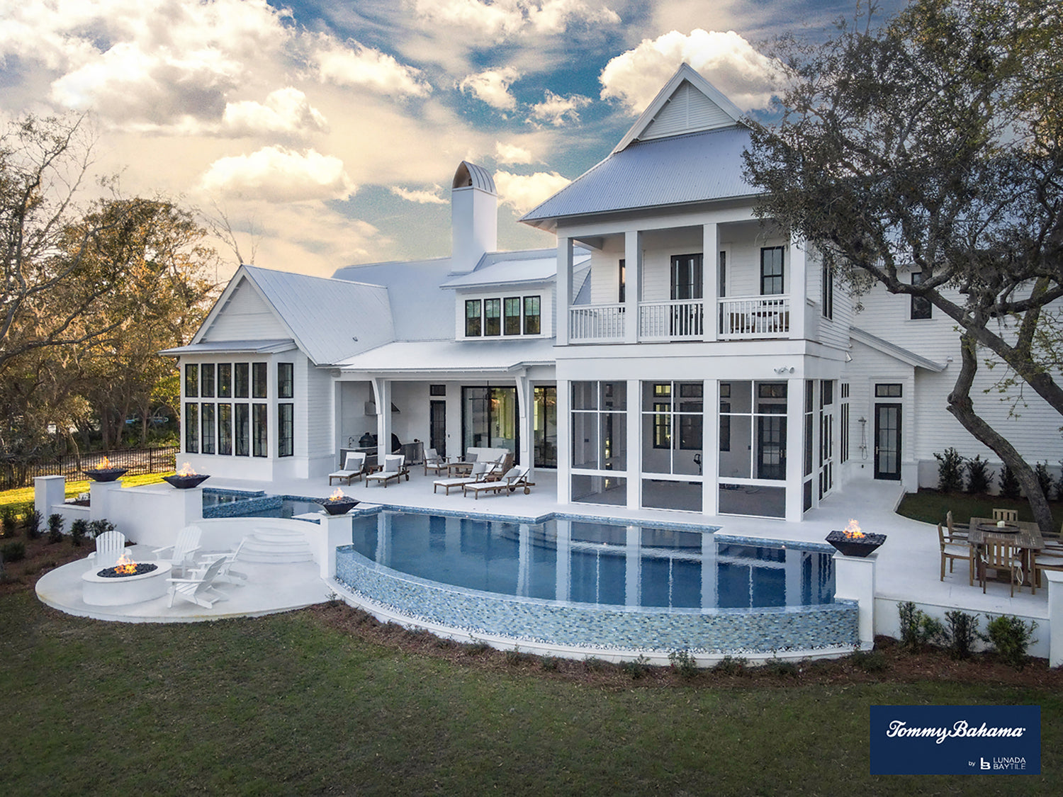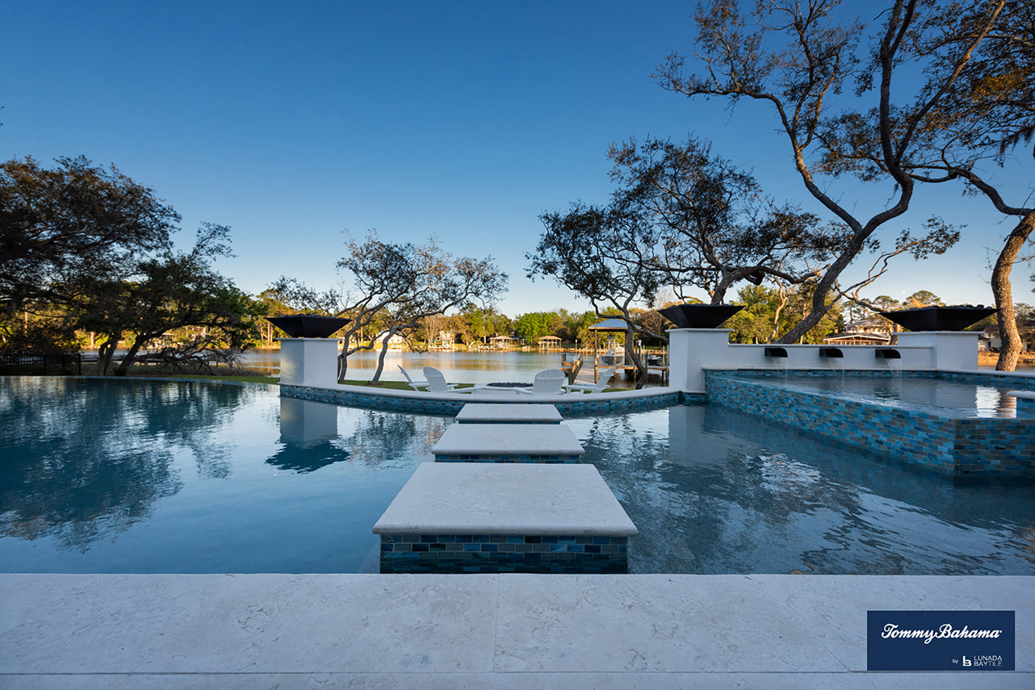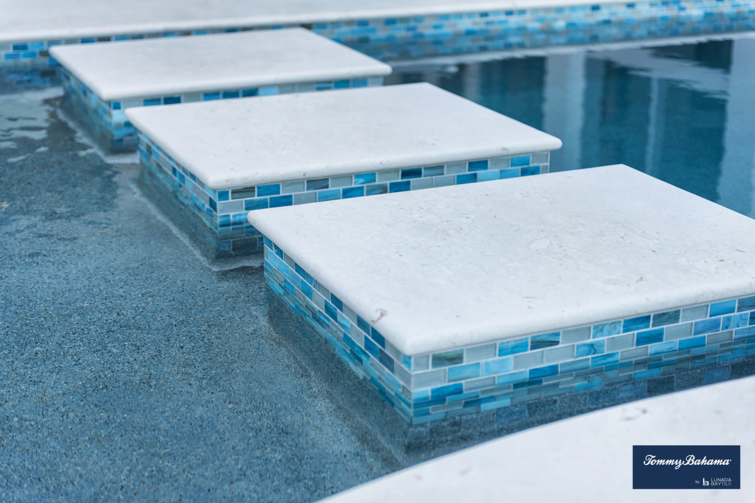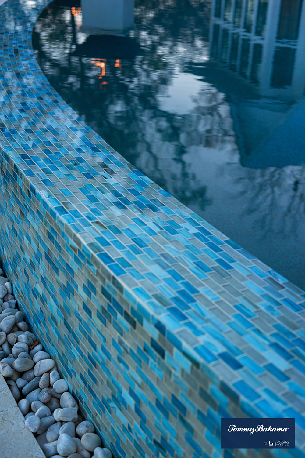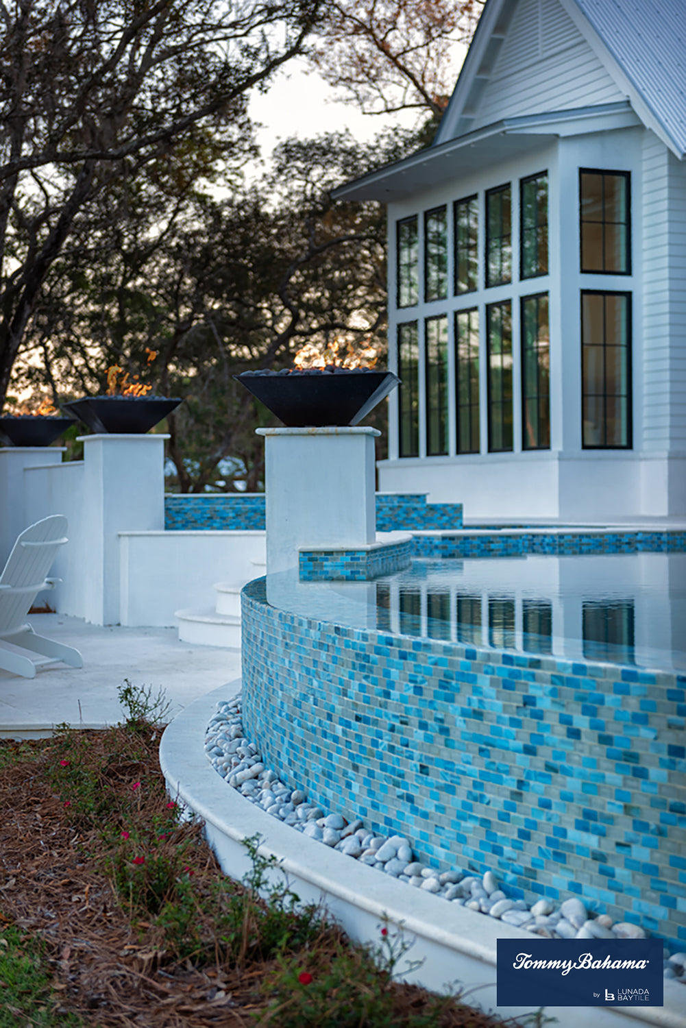 This outdoor space is a true oasis. The Tommy Bahama glass mosaic tile transforms and elevates the pool and spa and blends them with the landscape. It’s a celebration of nature, and a space in which one can relax, entertain, and enjoy warm summer days.