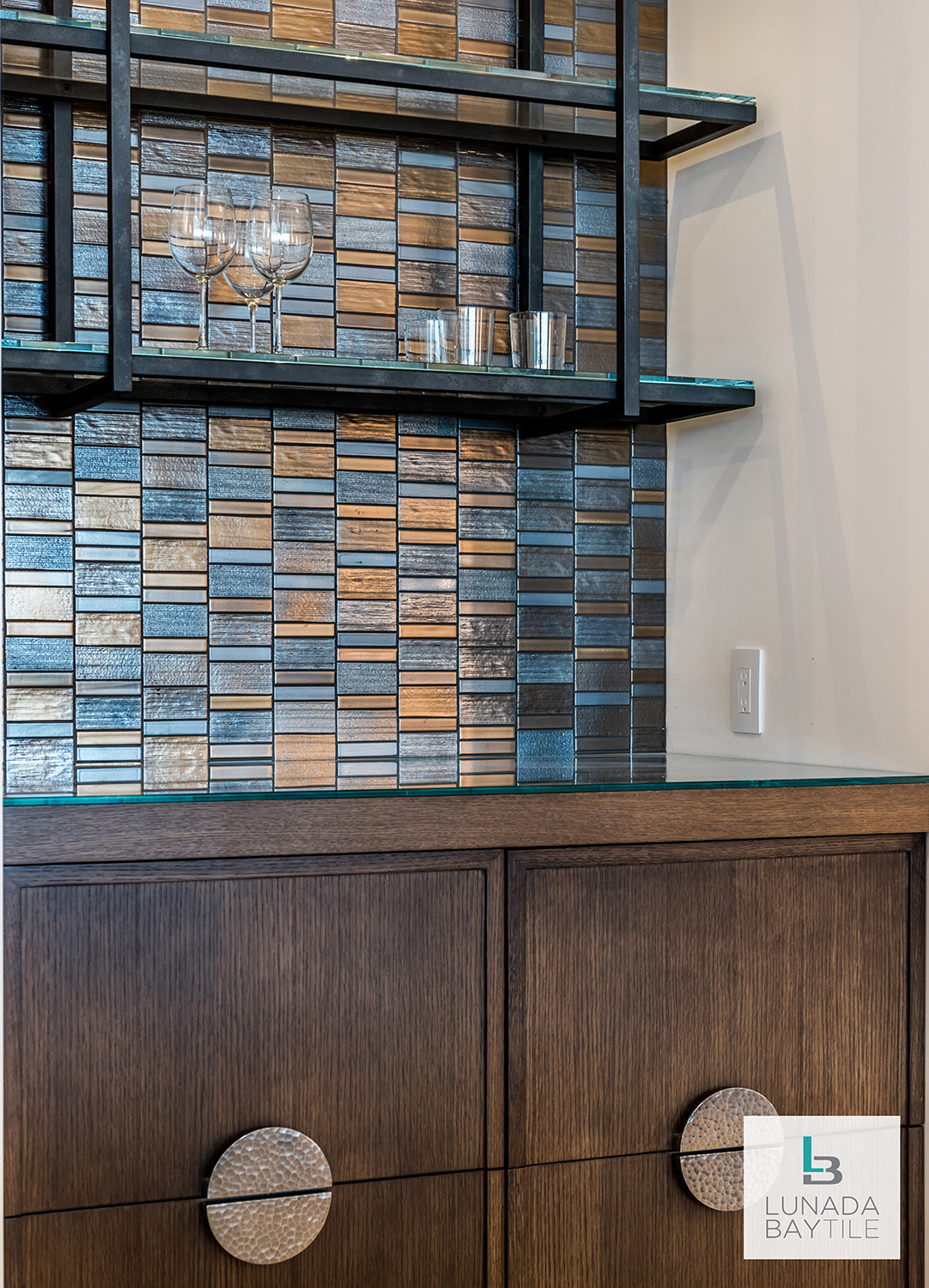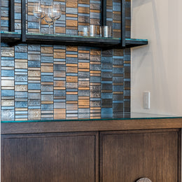 The warmth and variety in using the Shinju Swell Mosaic in Pacific at the back of the bar wall imbues an inviting and generous hospitality.
