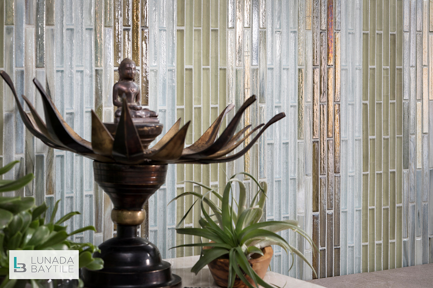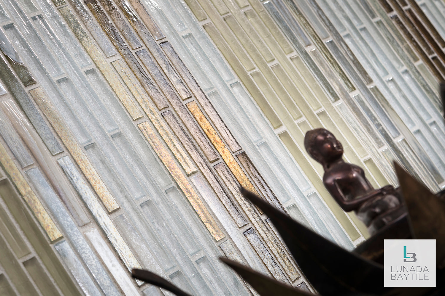 Earth tones in radiant, hand-crafted glass mosaic pattern from our Textile series bring a rich vibrancy and the feeling of a glamourous oasis. The linear Imberline pattern traditionally used in upholstery and drapery is recreated in this tile series through handcrafted 1/2 x 4" lustrous glass mosaics, and is perfect for walls and backsplashes where a dramatic stripe can make a visual impact. Seen here in our Anise colorway.