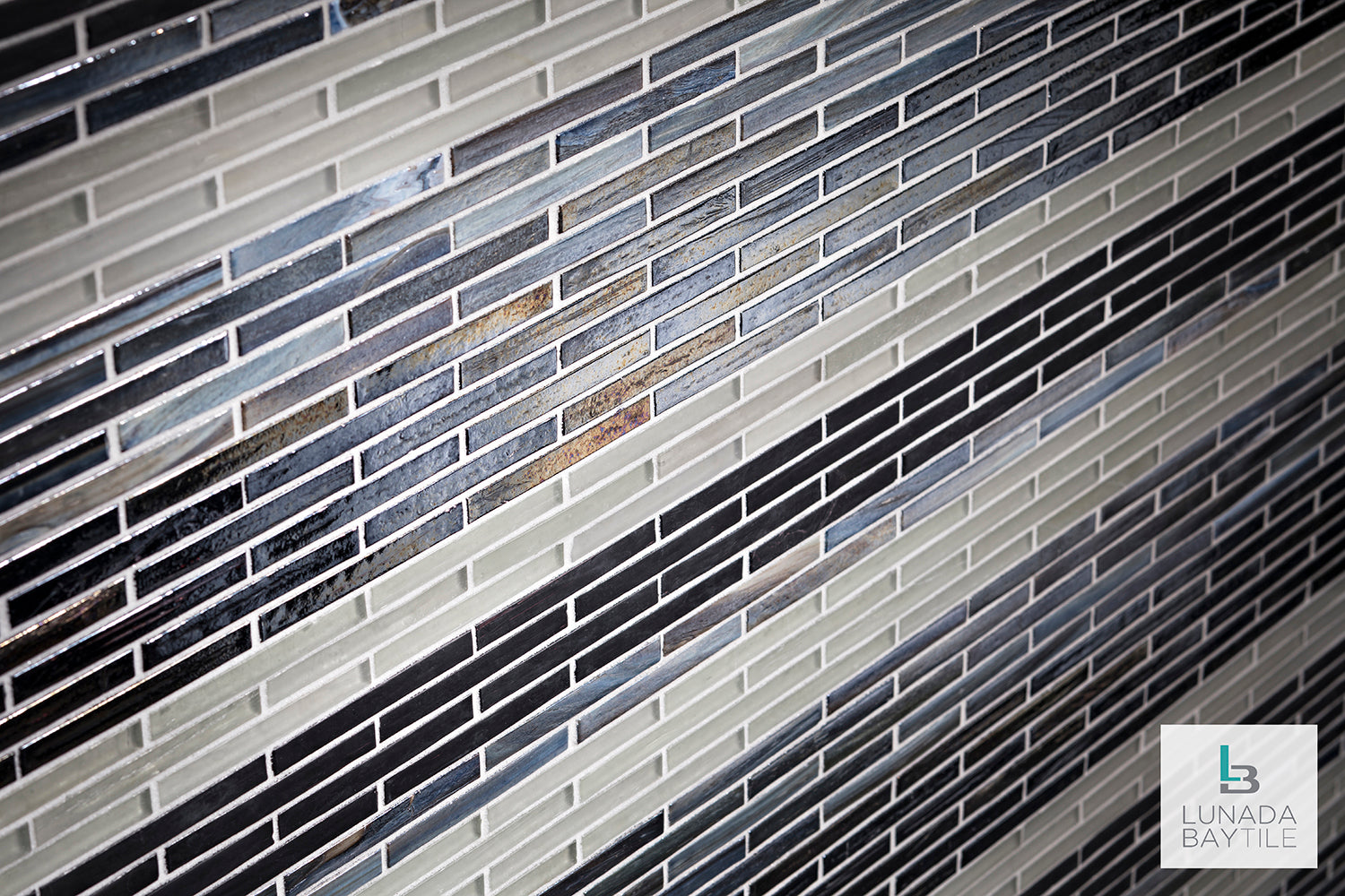 Black and white with grey tones in radiant, hand-crafted glass mosaic pattern from our Textile series create an expansive feeling space that is simultaneously grounded. The linear Imberline pattern traditionally used in upholstery and drapery is recreated in this tile series through handcrafted 1/2 x 4" lustrous glass mosaics, and is perfect for walls and backsplashes where a dramatic stripe can make a visual impact. Seen here in our Lunar Eclipse colorway.