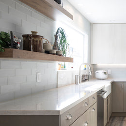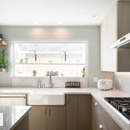 Tomei glass tiles covering the kitchen walls bring a sense of serenity and the Natural finish reflects light, making the space feel even more open.