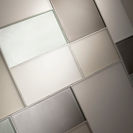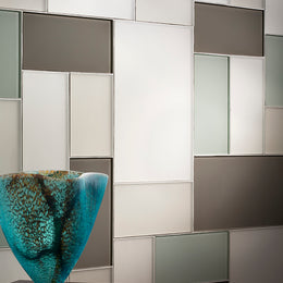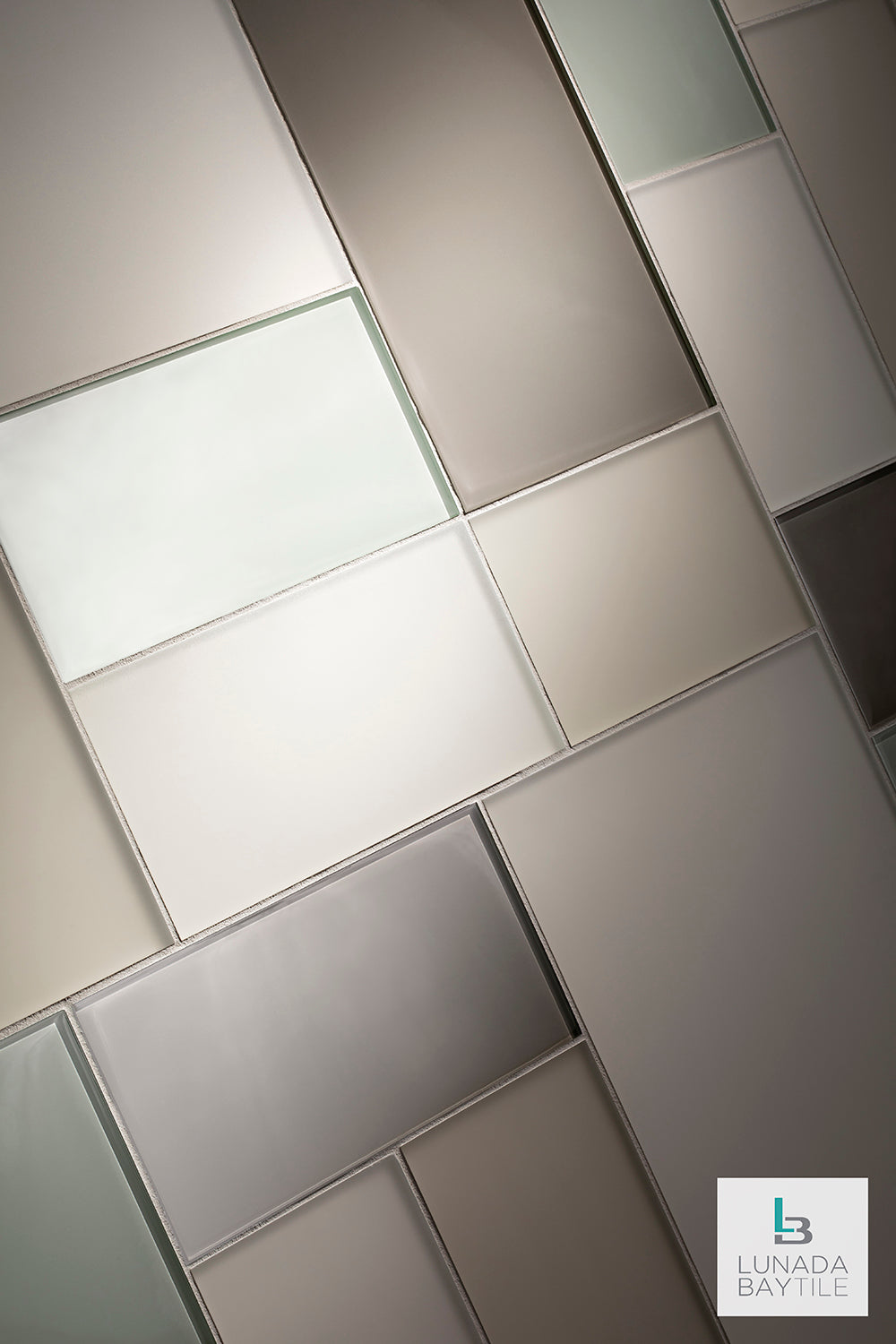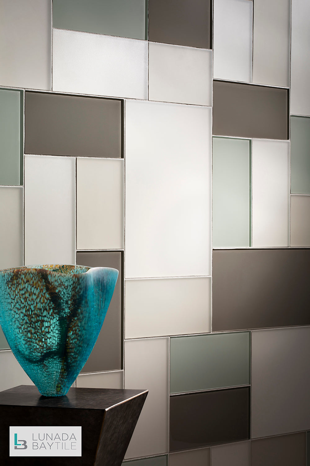 Random blend of Tomei Modules in Frost Green, Parchment, Pelican and Sand Dollar in both Natural & Silk finishes engage and ground the feeling in this space.