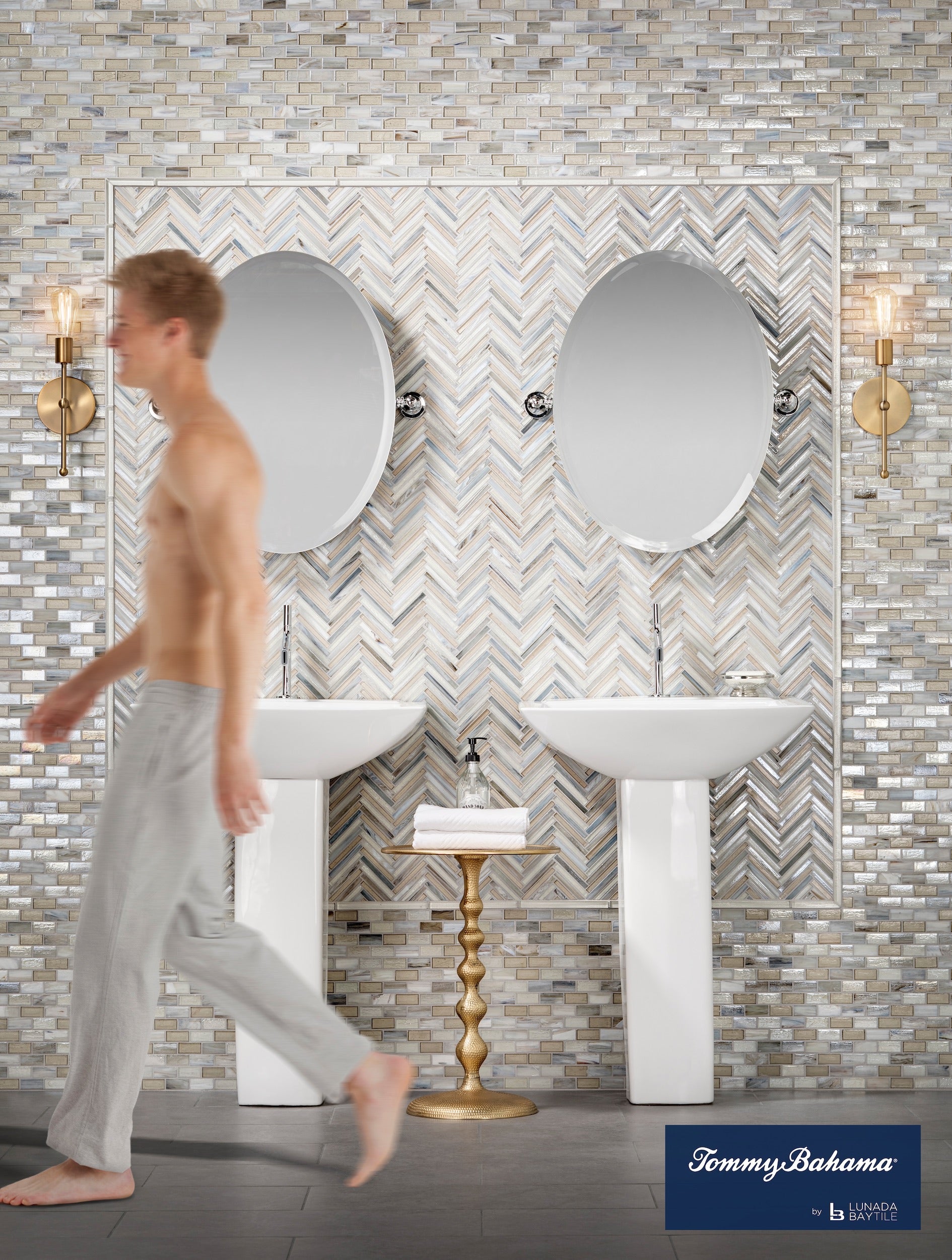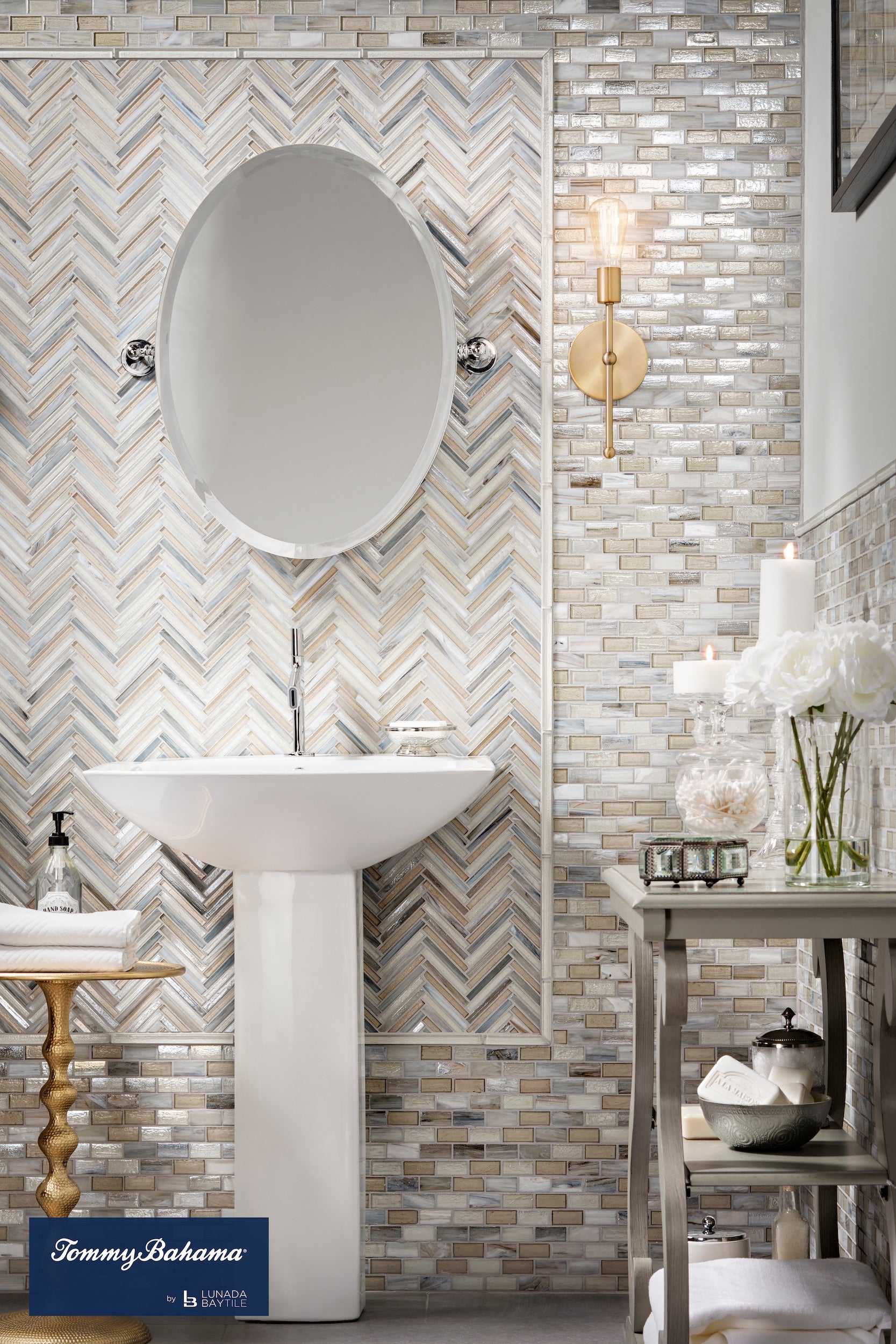 This elegant bathroom installation of Tommy Bahama® Glass Blends is sophisticated, yet earthy and unpretentious. Glass mosaics in 1x2 Brick and Zig & Zag patterns in the Cappadocia inspired colorway.