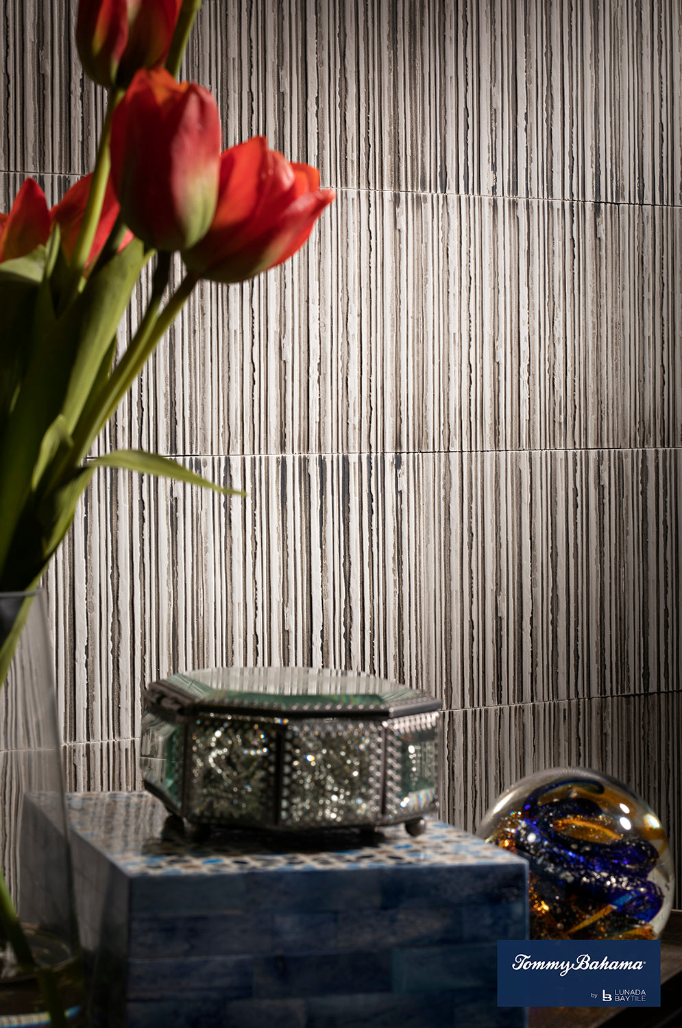 This sitting room wall is covered with Kapa from our Tommy Bahama collection of handcrafted concrete tiles. The pattern seen here is Tide Dye, named after the heritage Tommy Bahama® fabric with the same name. The tile emulates the feeling of rising and ebbing tides. The dimensionality and texture of this luxe concrete tile creates an energetic and captivating backdrop.