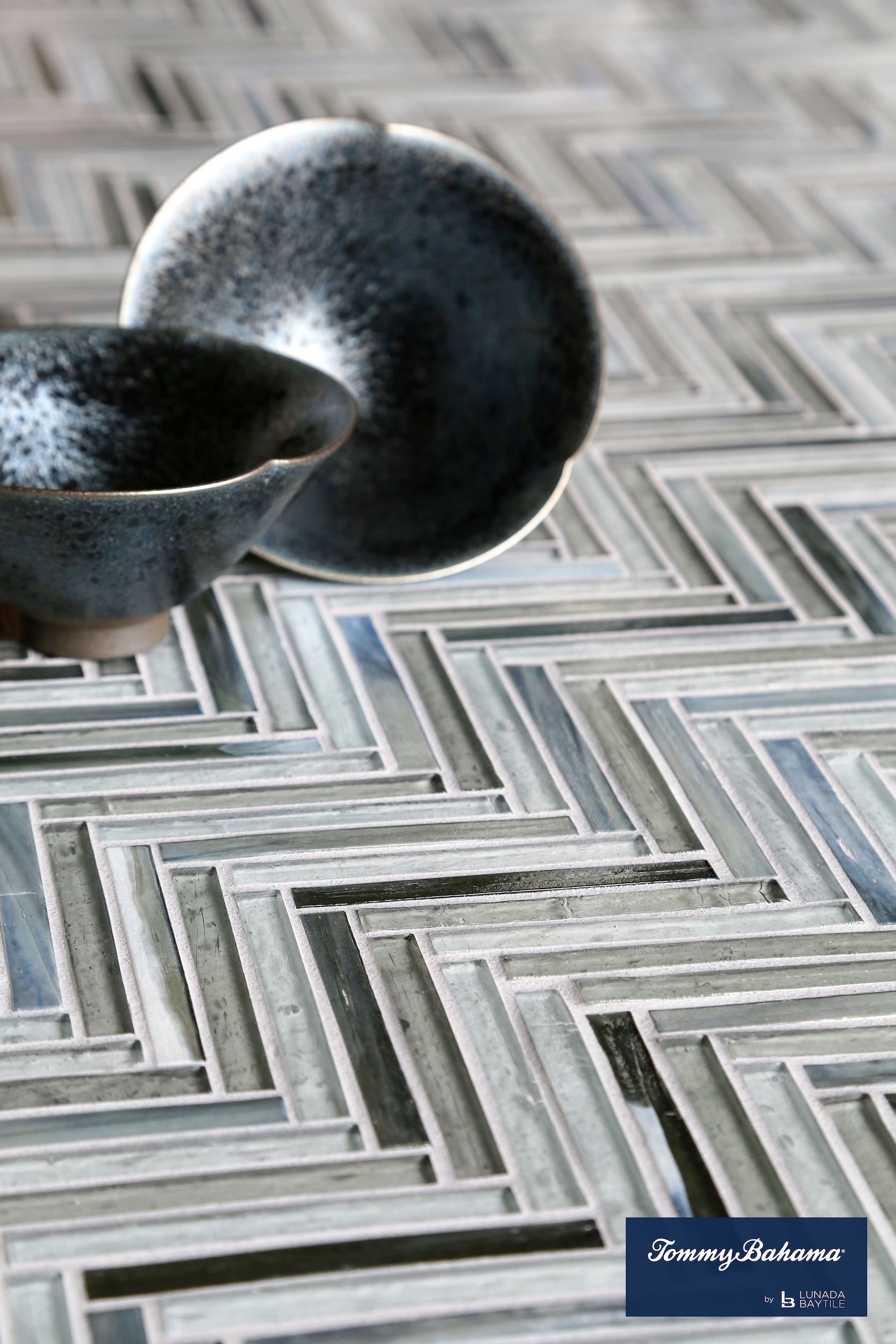 Tommy Bahama Glass Blends' Zig & Zag pattern on powder room floor. The gray stone and icy blue water of the terraces formed by streams and hot springs gives inspiration to the Pamukkale colorway.