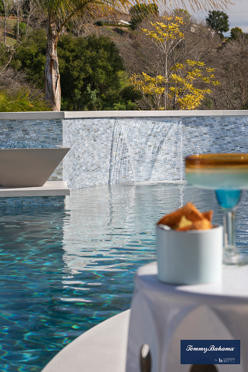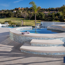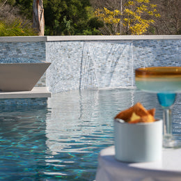 Lunada Bay Tile’s glass mosaic tile introduces a “wow factor” to outdoor installations. Pool designers can draw from a plethora of patterns, colors and sizes to create a stunning bespoke environment. Not only are glass tiles beautiful, the product is qualified for chlorine, salt, or saline chlorinated pools. Glass tiles do not fade, warp, or need high maintenance. The tiles are smooth to the touch and can be used on the pool floor and walls.