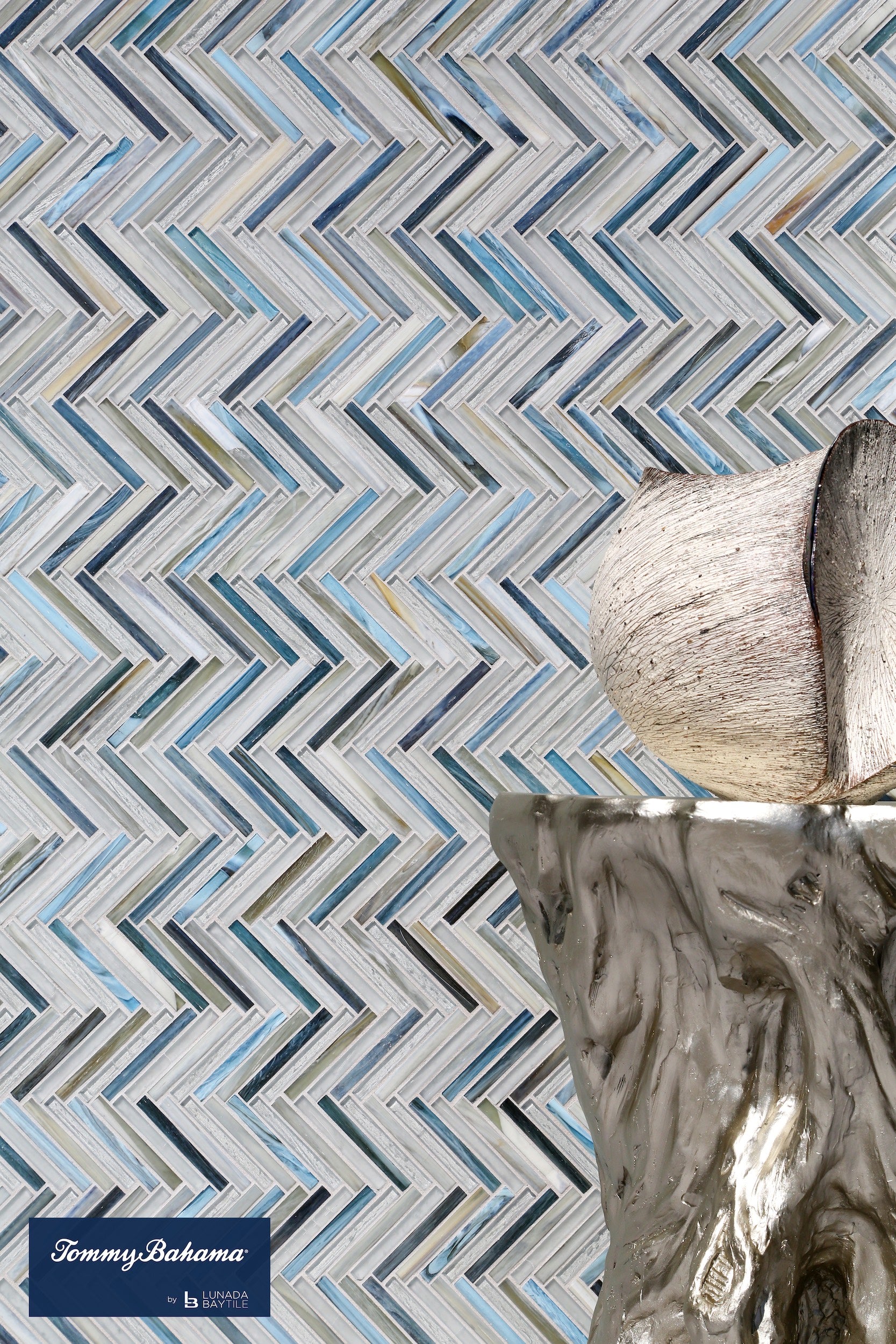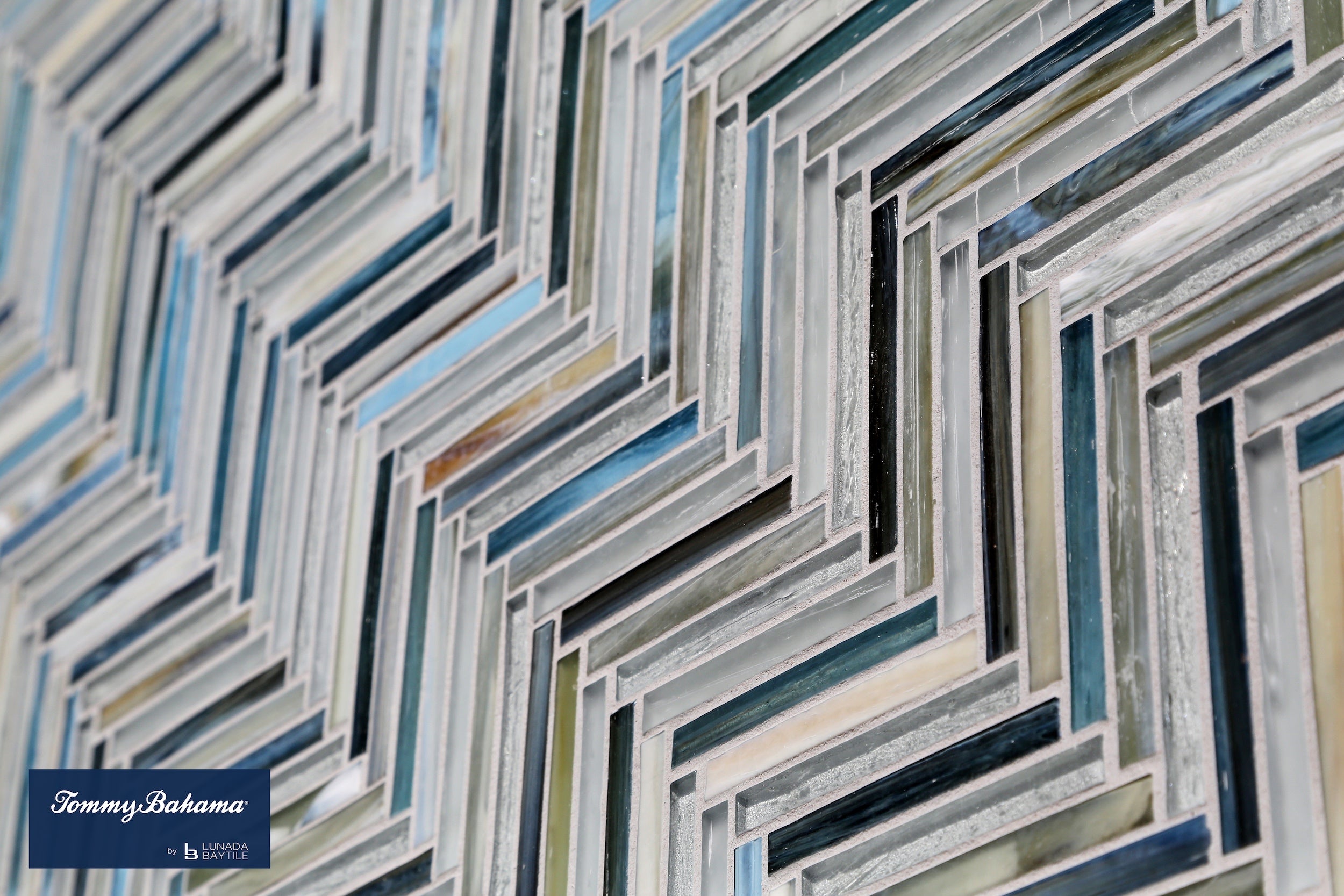 Tommy Bahama Glass Blends Zig & Zag in Kangaroo Island on feature wall. Be surrounded by the soaring cliffs, dense forests, golden sand dunes and lush wetlands of the island through this color blend.
