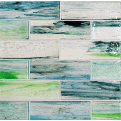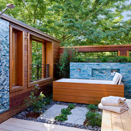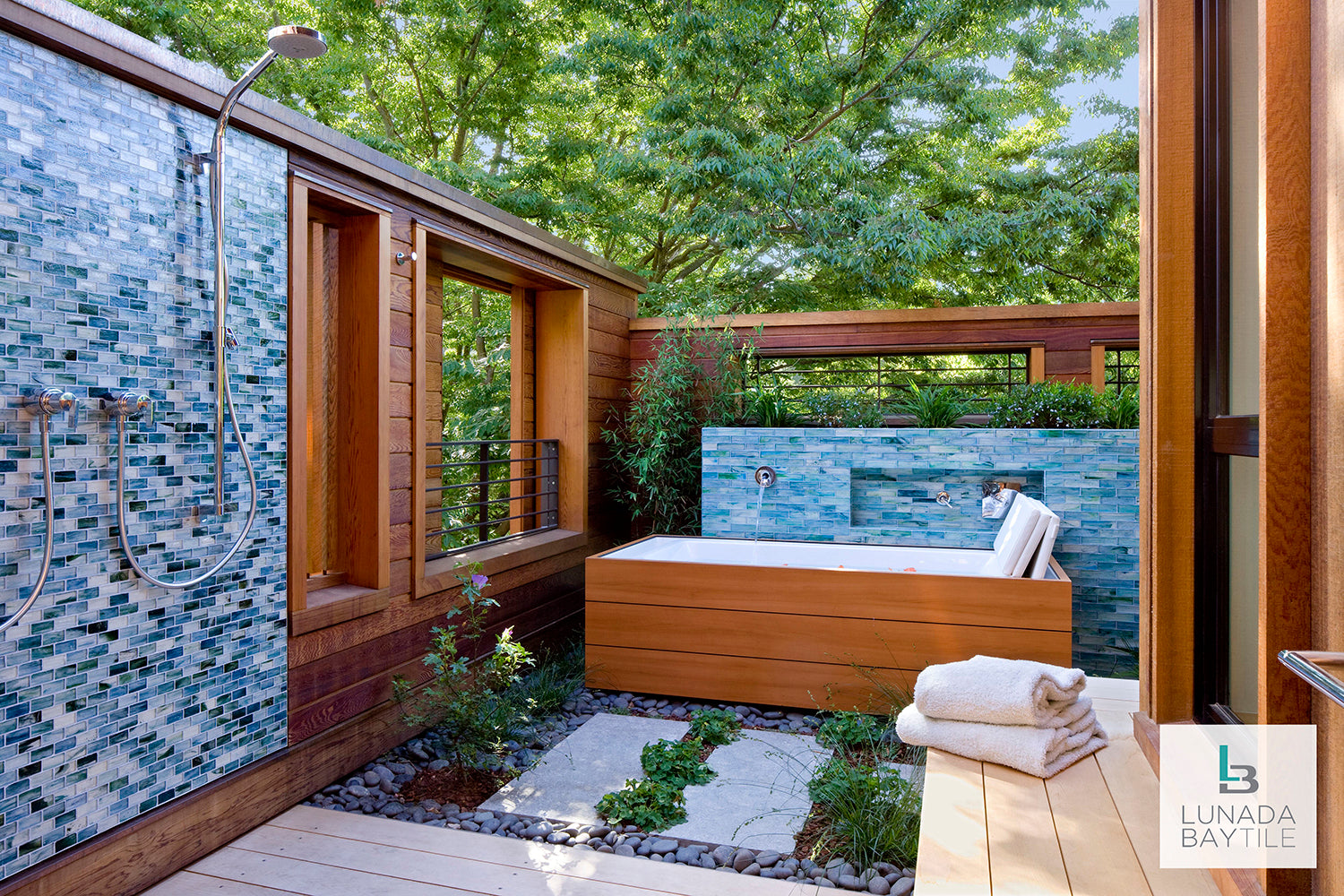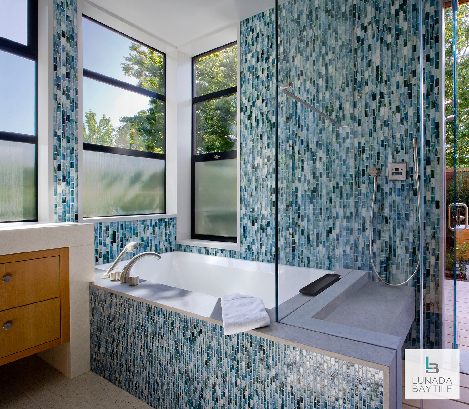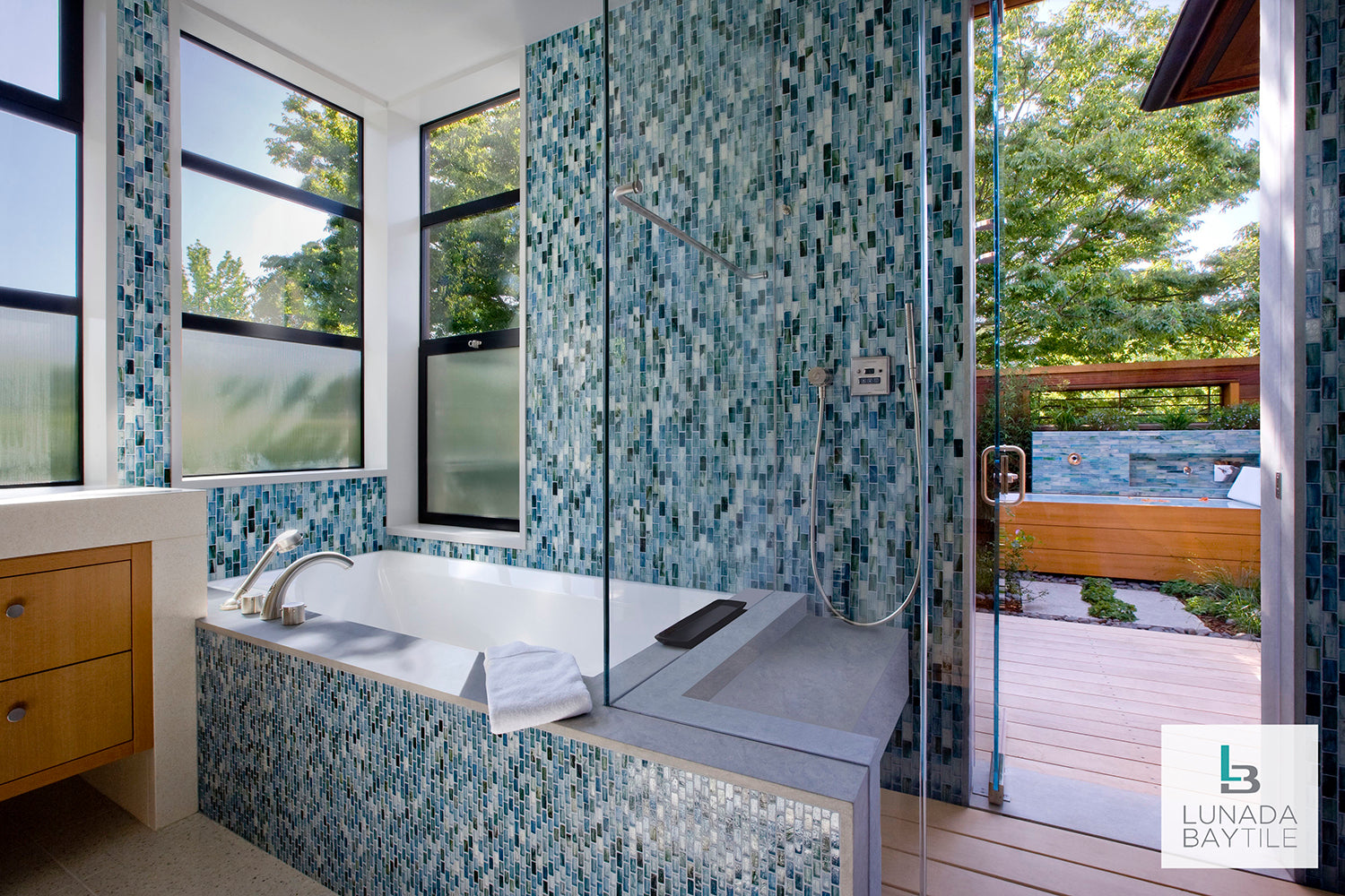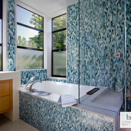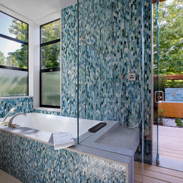 Tozen 2x6 Erbium Natural on the exterior spa wall. Tozen 1x2 Iodine Natural on the interior bath and exterior shower wall.